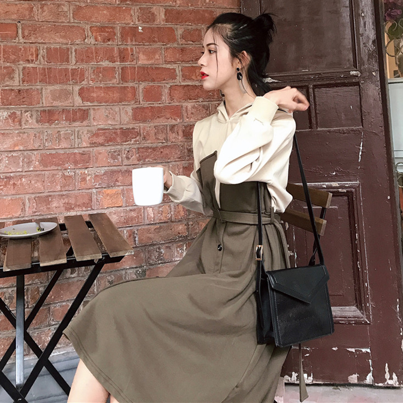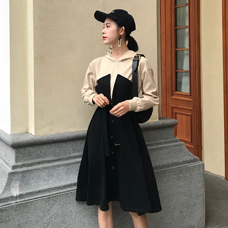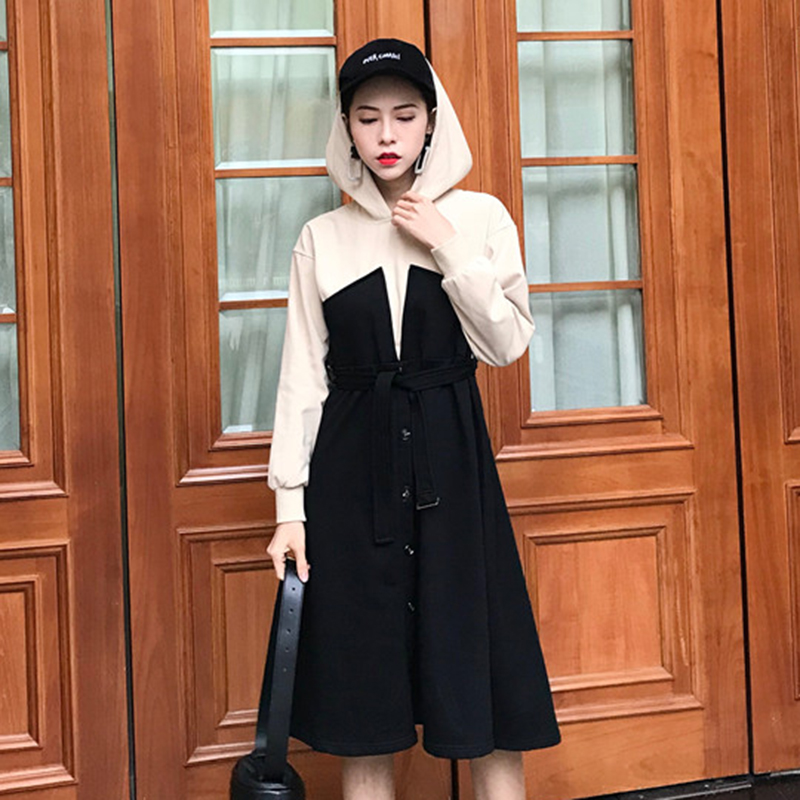 冷淡風拼色長袖風衣連衣裙秋裝女2018新款時尚收腰連帽A字中裙子