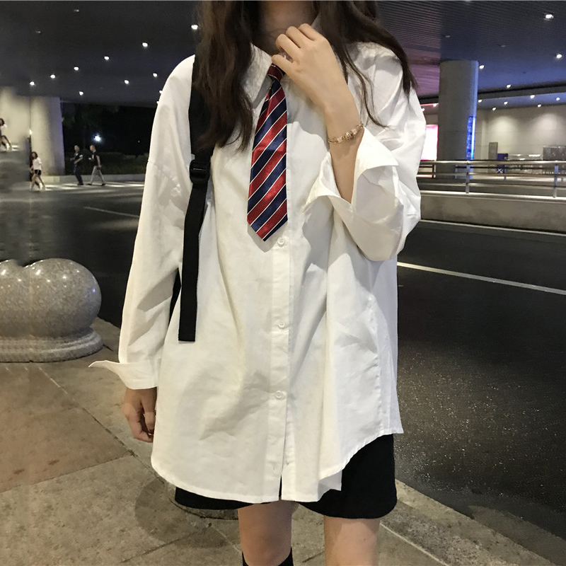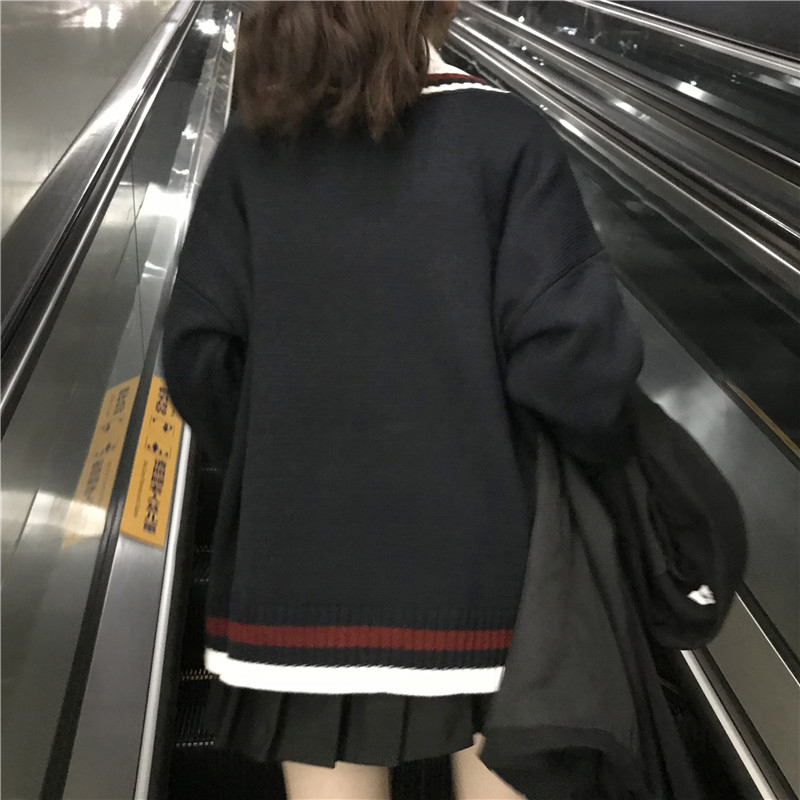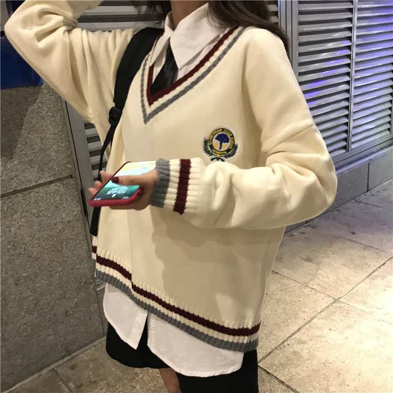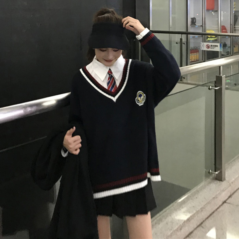/ 學院風韓版V領毛衣馬甲背心女寬松領帶白色襯衫2018秋裝新款套裝