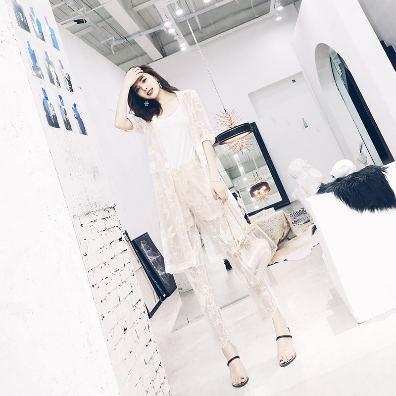 / S秀名媛氣質夏季套裝女2018新款時髦網紗拼接印花披肩時尚兩件套