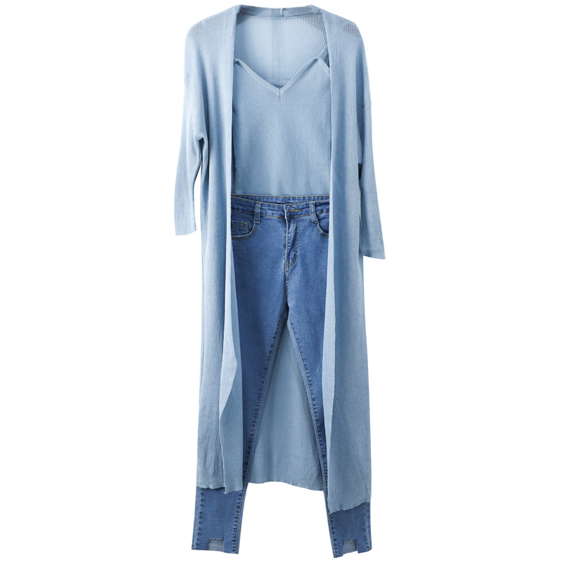 時尚套裝女牛仔小腳褲2018秋季新款中長款針織長袖開衫吊帶三件套