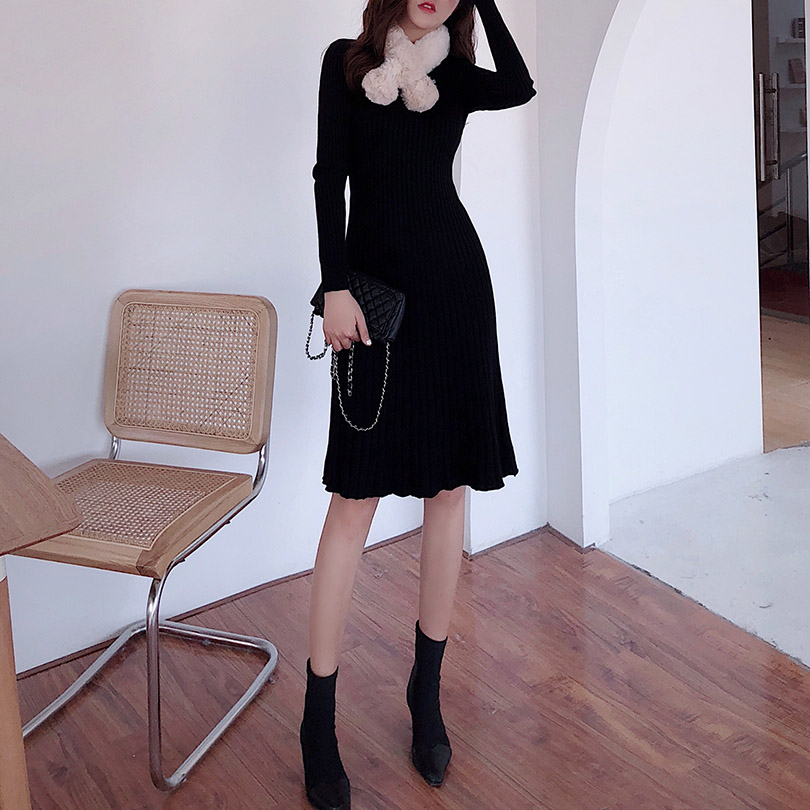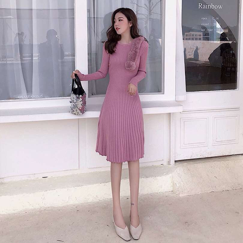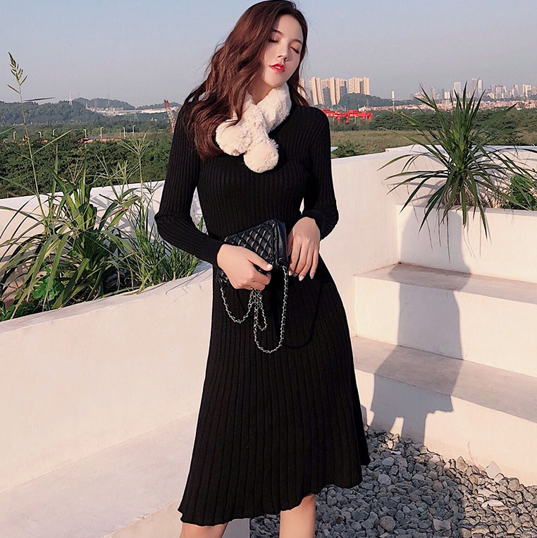韓版針織裙溫柔風套頭毛衣女秋冬2018新款裙子中長款針織連衣裙女