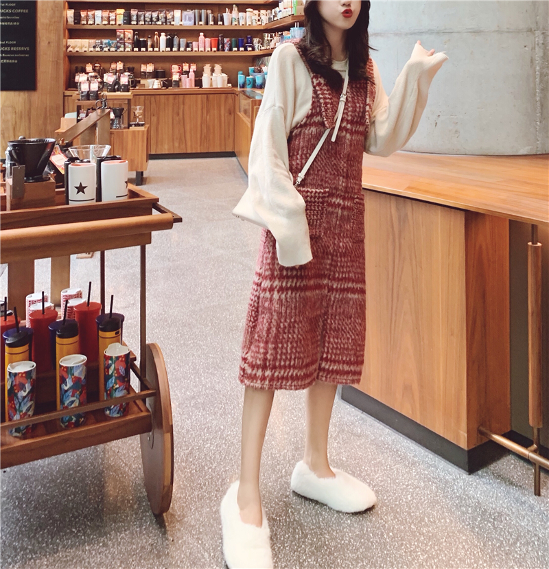 不要以為秋冬穿背帶裙會冷噢,毛呢的材質是很有質感的,穿起來暖暖的