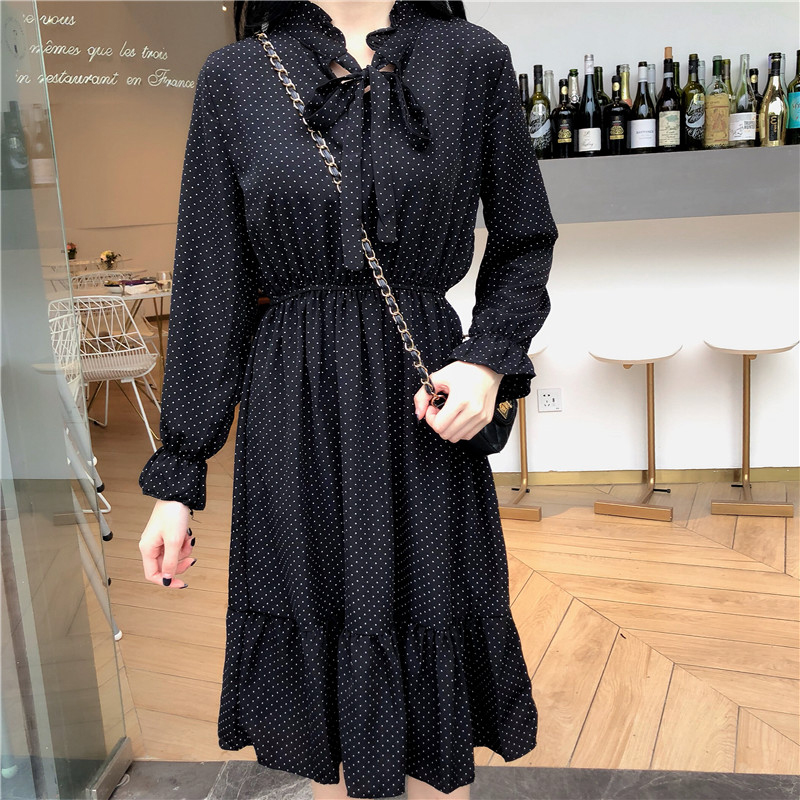 / 復古蝴蝶結波點中長雪紡連衣裙子秋冬裝新款法式少女荷葉邊桔梗裙