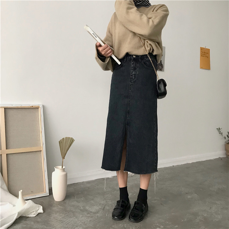 / 秋冬女裝韓版中長款開叉牛仔裙半身裙寬松過膝裙子高腰A字裙長裙
