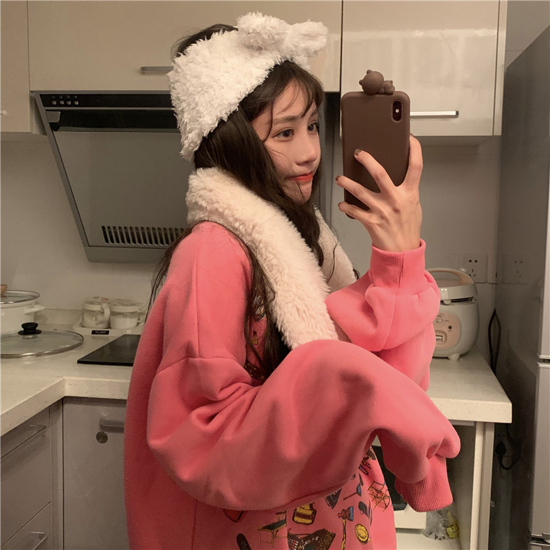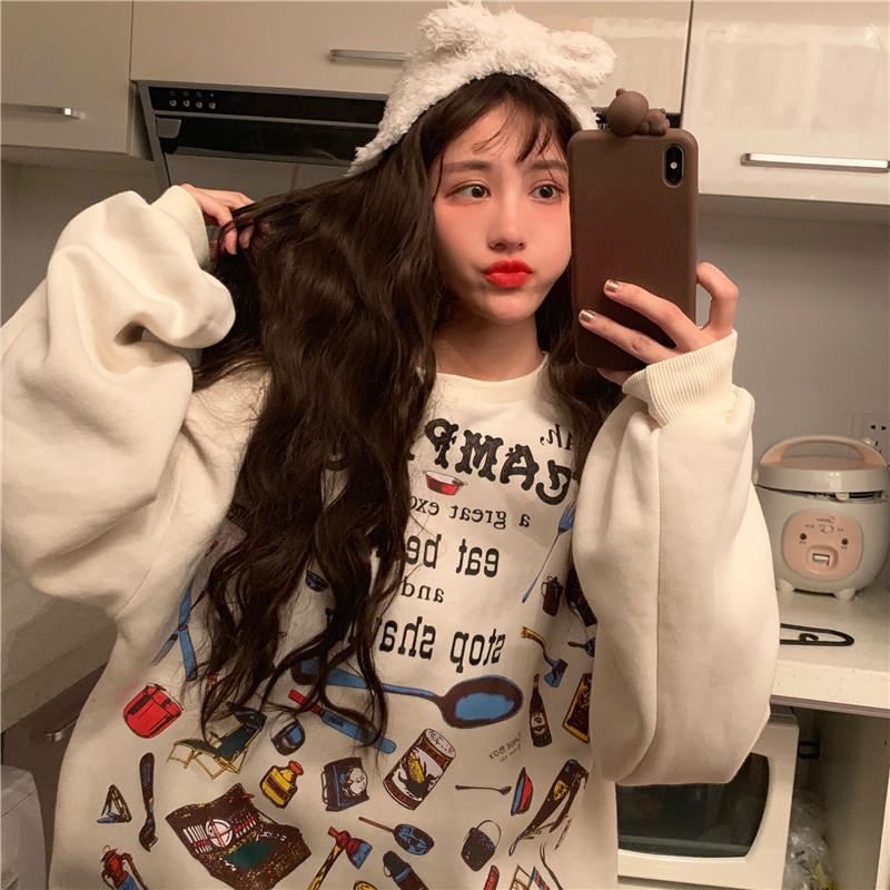chic上衣慵懶風寬松衛衣女秋冬2018新款百搭涂鴉小怪獸加絨衛衣潮