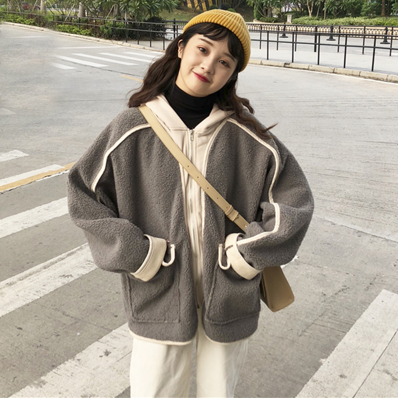 chic學院風羊羔毛外套女秋冬裝2018新款韓版寬松長袖連帽棉衣服潮