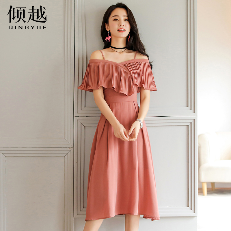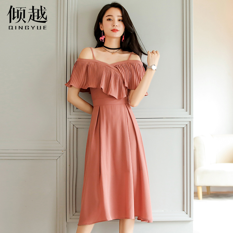 2017新款時尚顯瘦一字領露肩連衣裙長裙女韓版中長款吊帶裙子夏潮