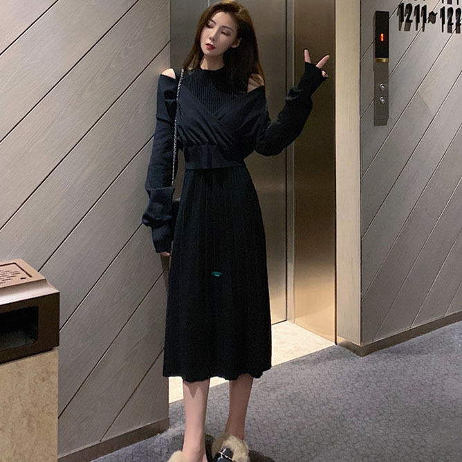 / 復古韓國chic風V領蝙蝠袖短款毛衣女2018新款+百褶針織背心連衣裙
