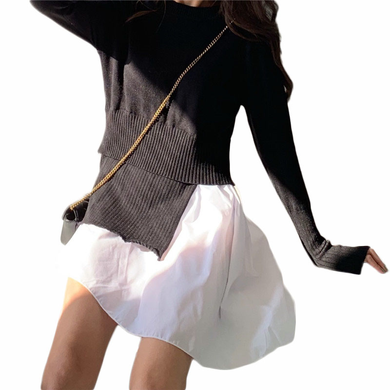 韓版寬松顯瘦假兩件加絨衛衣2018新款女秋中長款拼接木耳邊衛衣裙