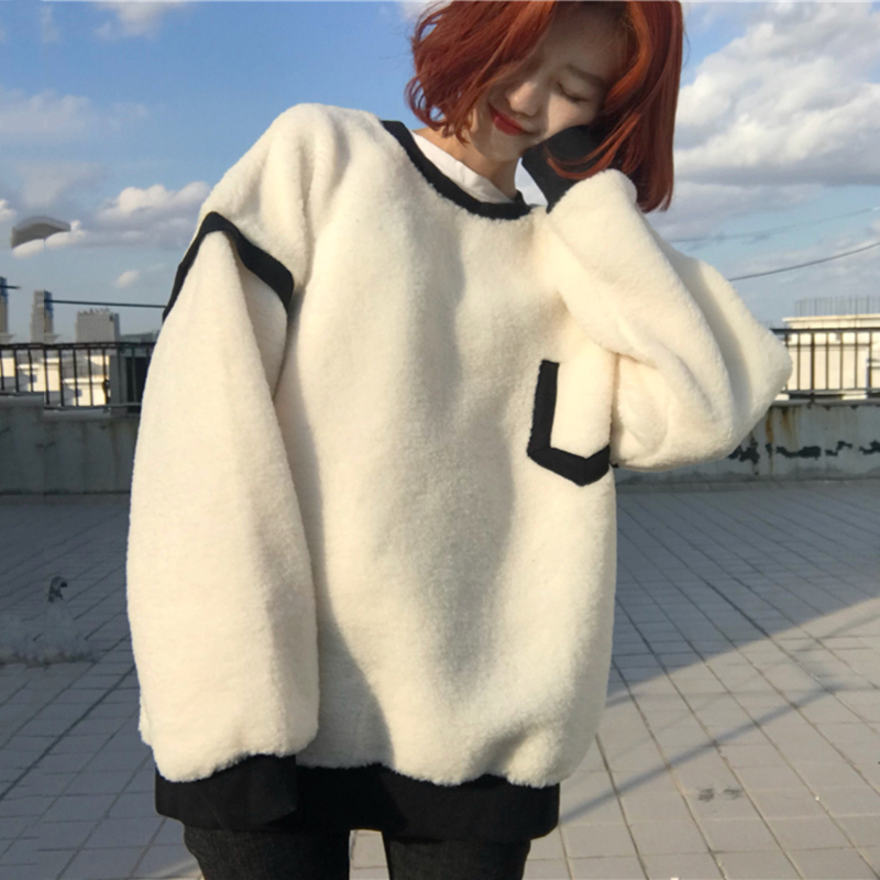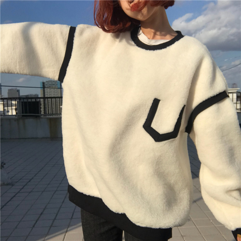 / 秋裝女2018新款韓版仿羊羔絨拼色衛衣慵懶寬松燈籠袖上衣時尚外套