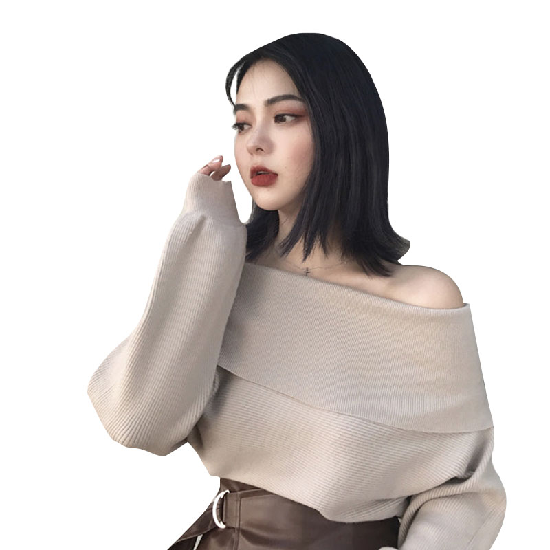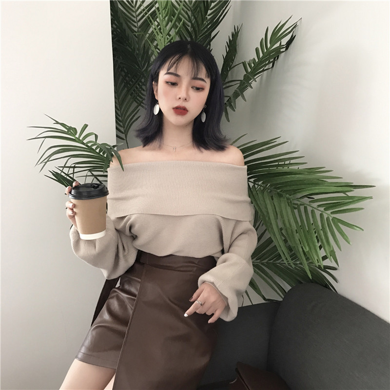 秋季女裝韓版chic復古氣質純色一字領露肩寬松長袖毛衣針織衫上衣