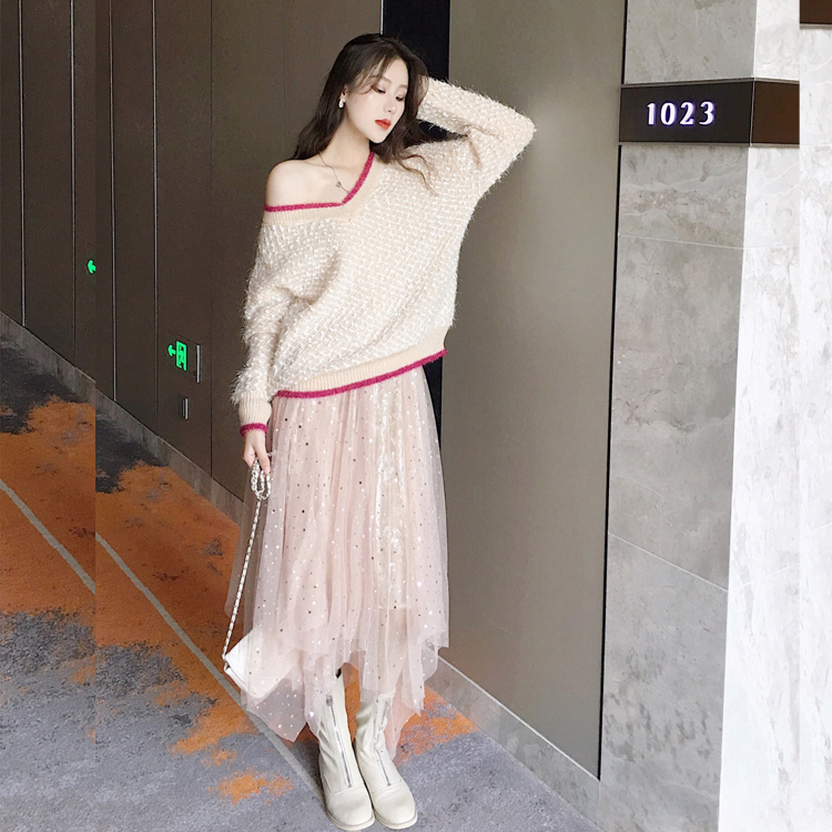 杏色毛衣|粉色毛衣|杏色星星半身裙|粉色半身裙