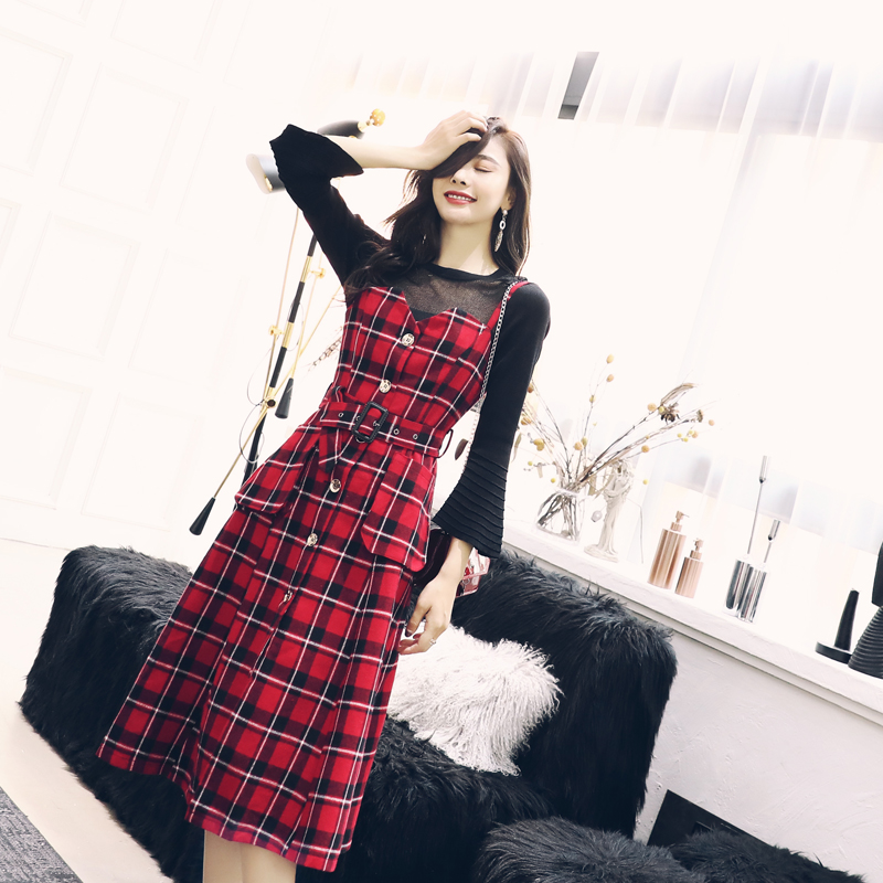 秋裝女2018新款針織長袖上衣吊帶裙兩件套套裝顯瘦收腰格子連衣裙