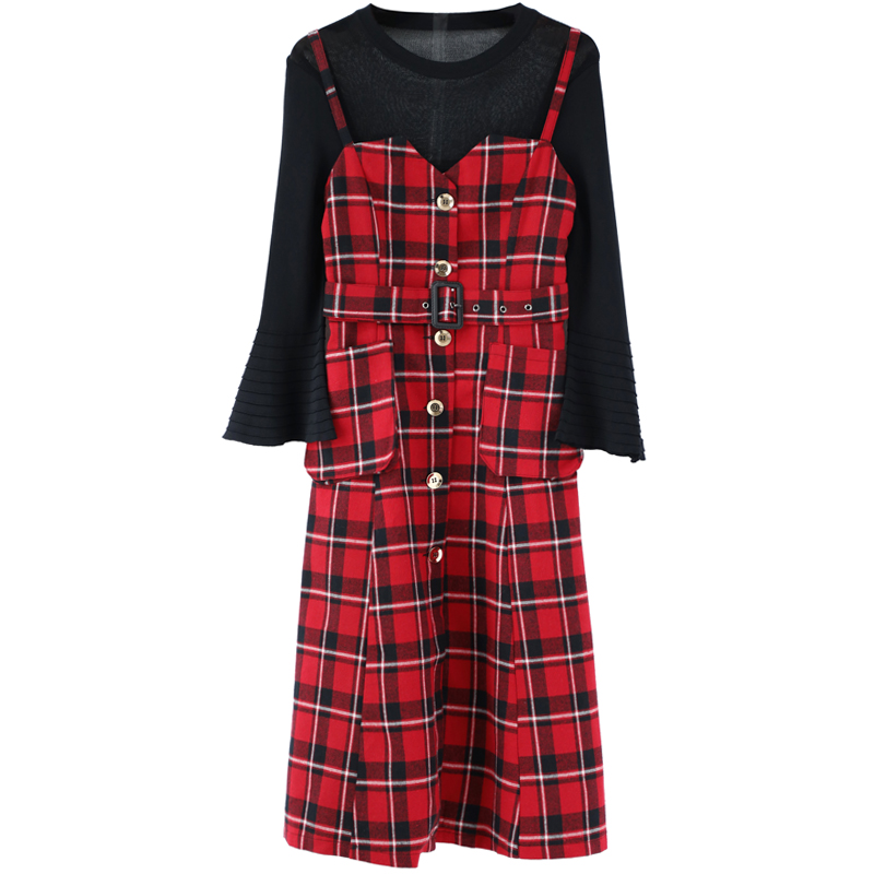 / 秋裝女2018新款針織長袖上衣吊帶裙兩件套套裝顯瘦收腰格子連衣裙