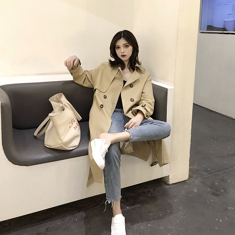 時尚袖口撞色翻邊設計純棉風衣女中長款韓版秋季2018新款修身外套