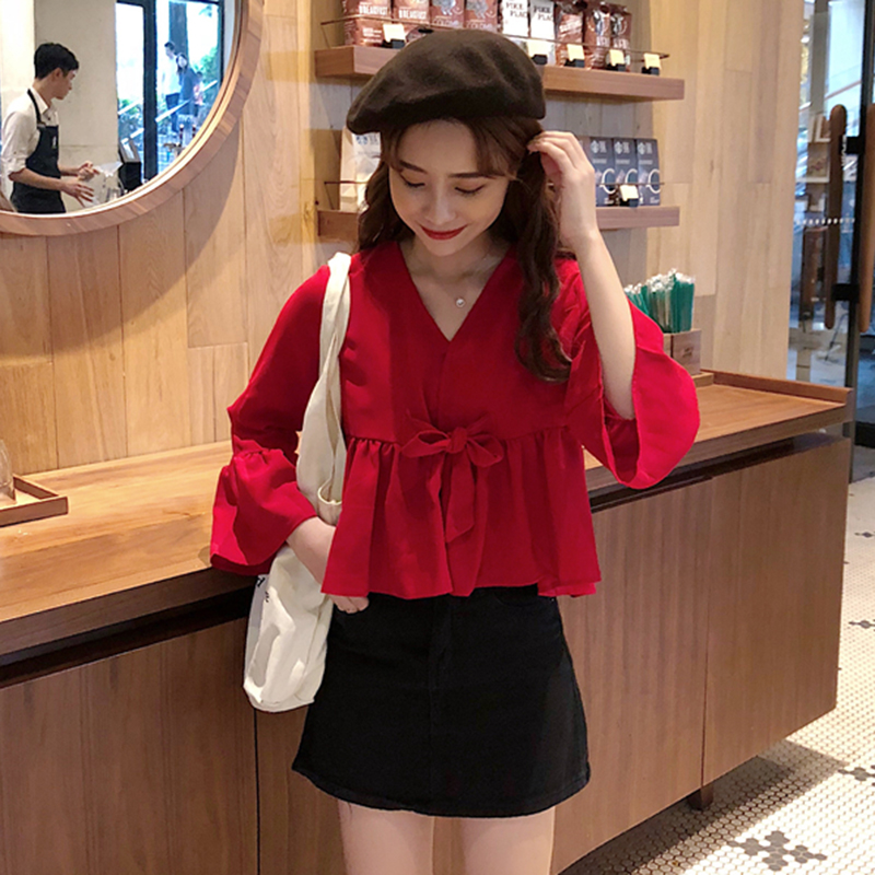/ 遮肚子雪紡娃娃衫秋裝女2018新款韓版顯瘦V領荷葉袖短款黑色上衣