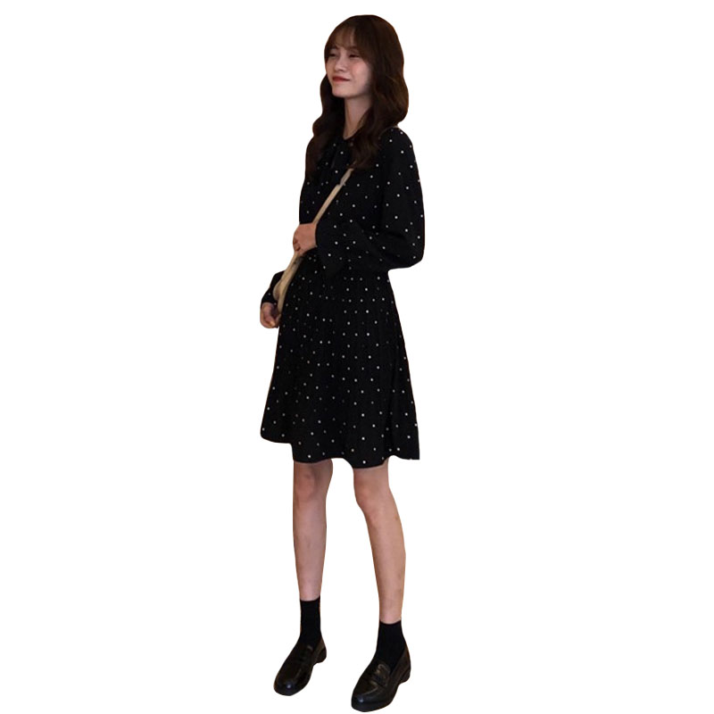 / 秋季女裝韓版氣質中長款波點壓褶長袖連衣裙chic復古港味學生裙子