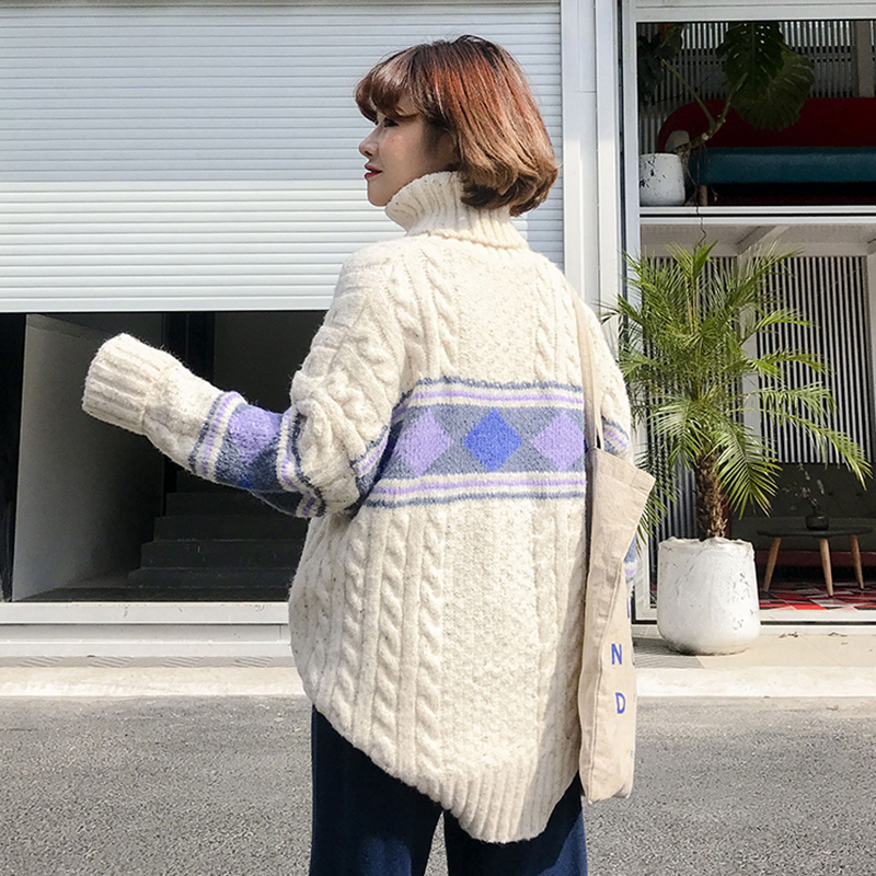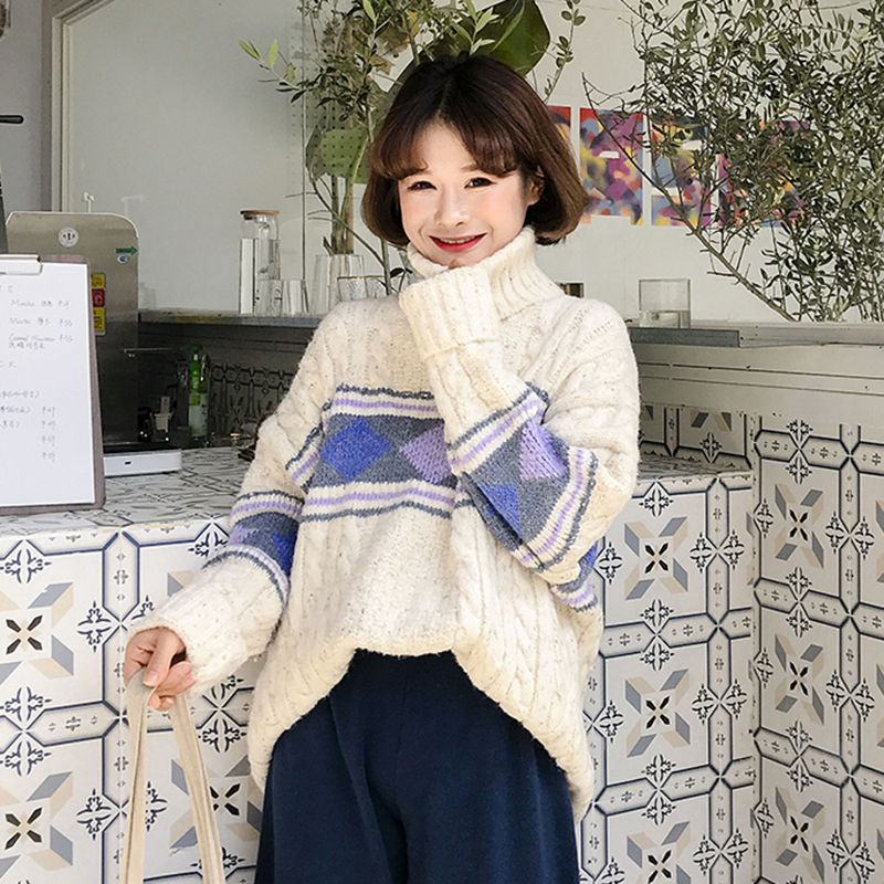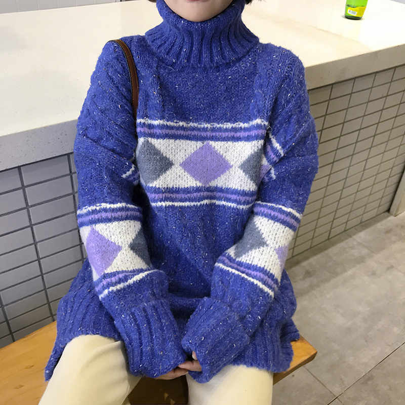 秋冬女裝2018新款韓版中長款高領針織衫學生寬松幾何圖形毛衣外套