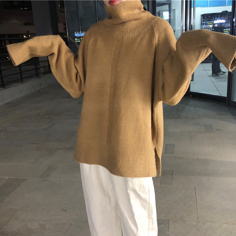 慵懶風高領下擺開叉針織衫女秋冬裝2018新款網紅寬松套頭毛衣外套