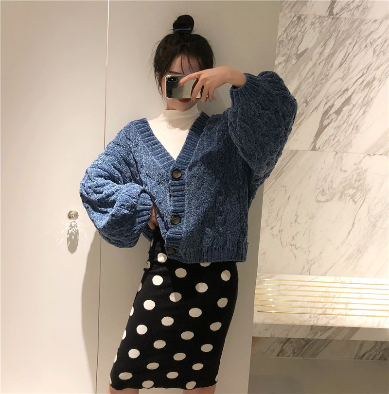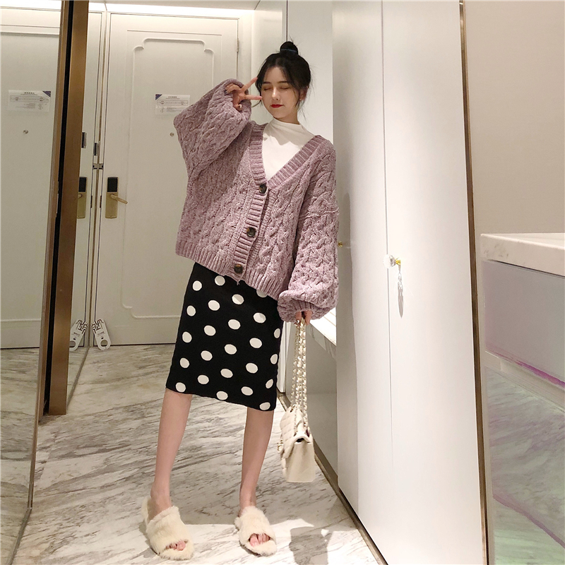 / 港味新款韓版時尚套裝短款麻花毛衣開衫兩件套女裝波點針織半身裙