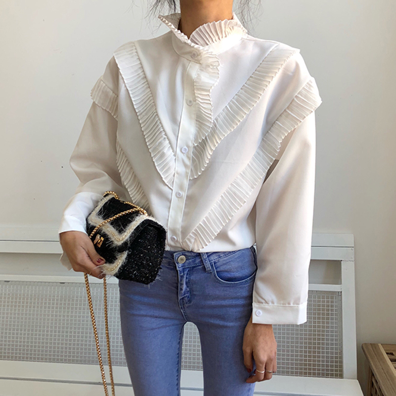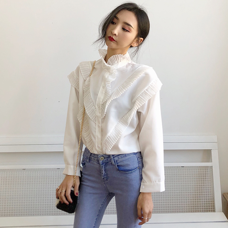 / 壓褶立領長袖襯衫女秋冬裝新款寬松顯瘦白色襯衣學生復古休閑上衣