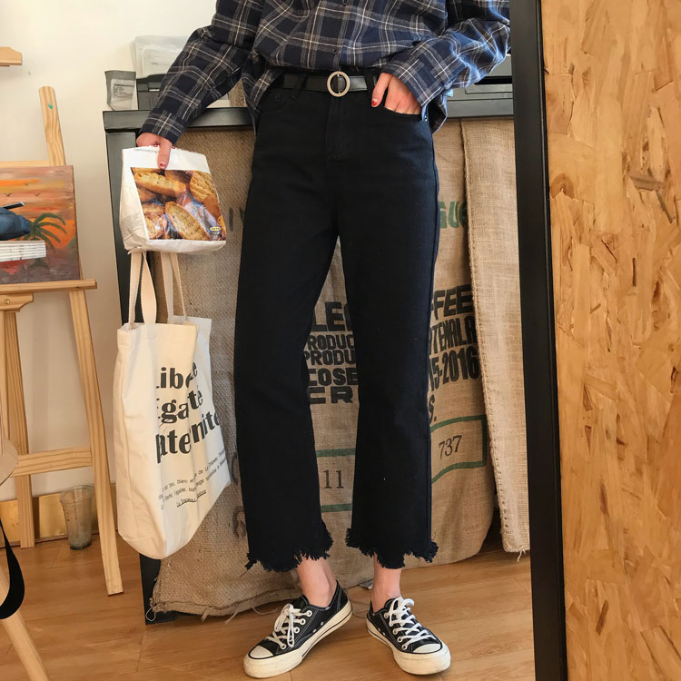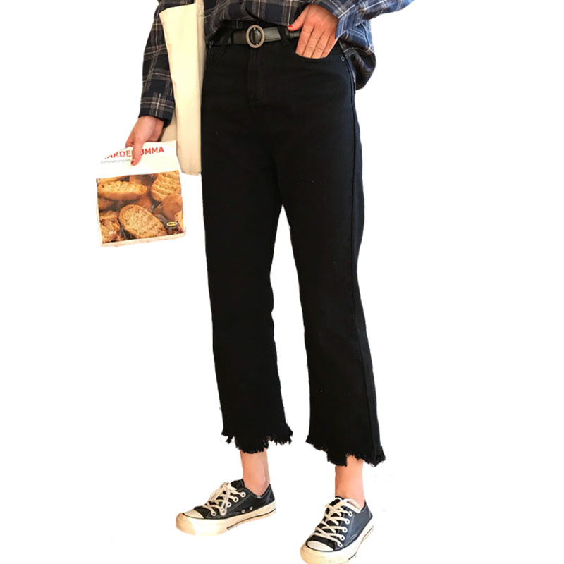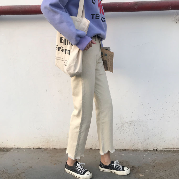 / 秋裝女裝韓版寬松不規則邊高腰寬松牛仔褲闊腿褲顯瘦直筒褲長褲潮