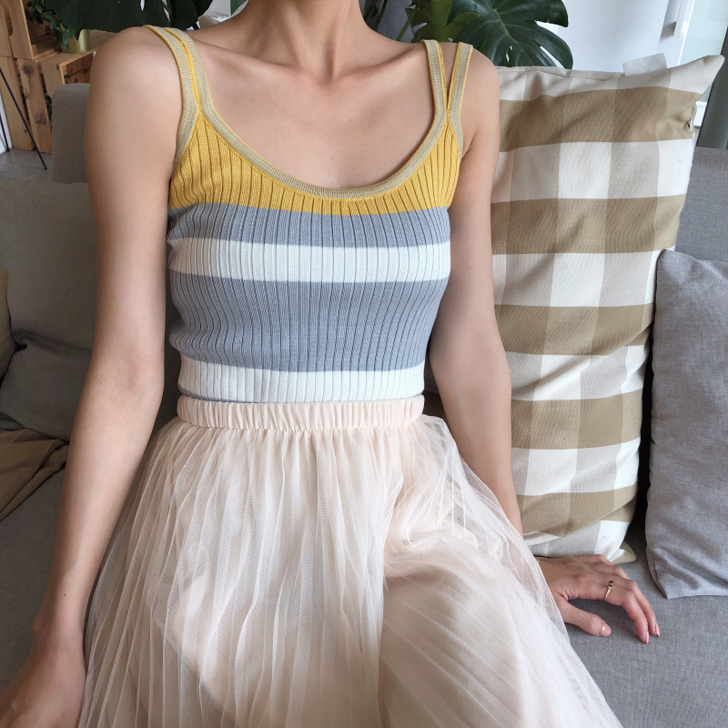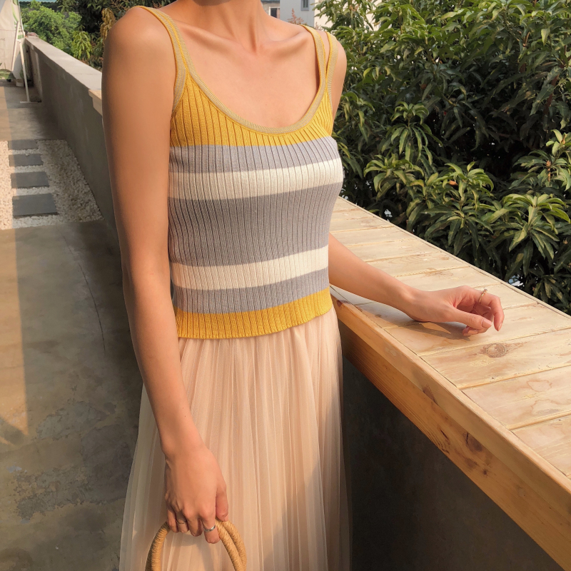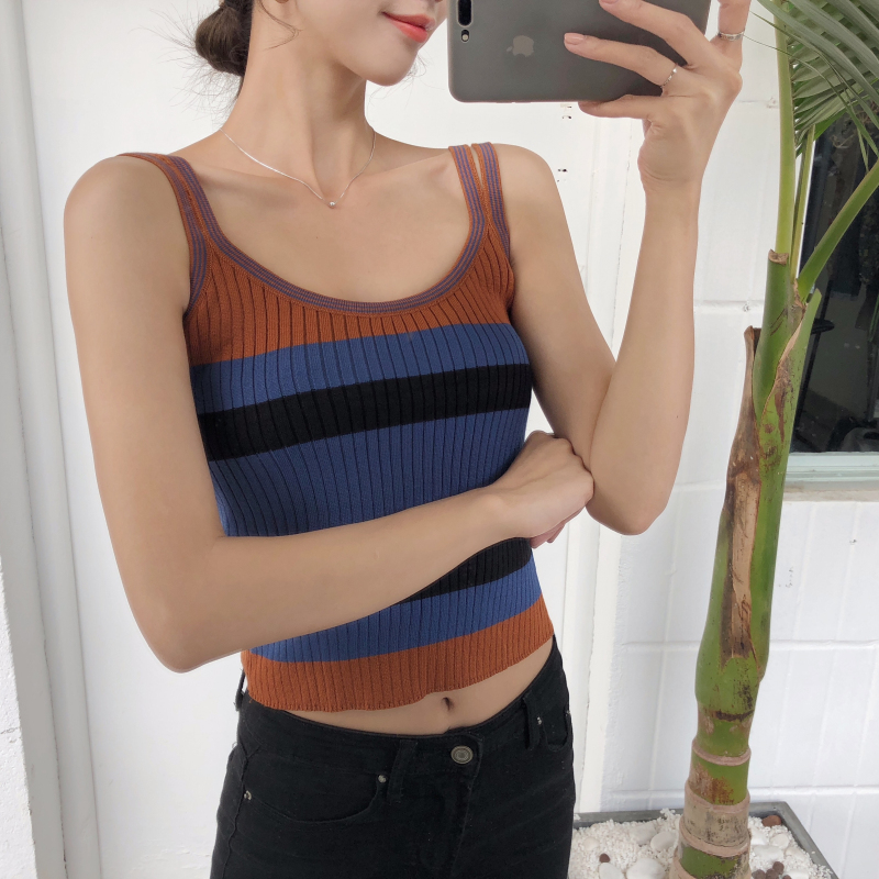 / 韓國chic風修身雙肩帶大條紋吊帶背心港味復古百搭針織衫女上衣潮