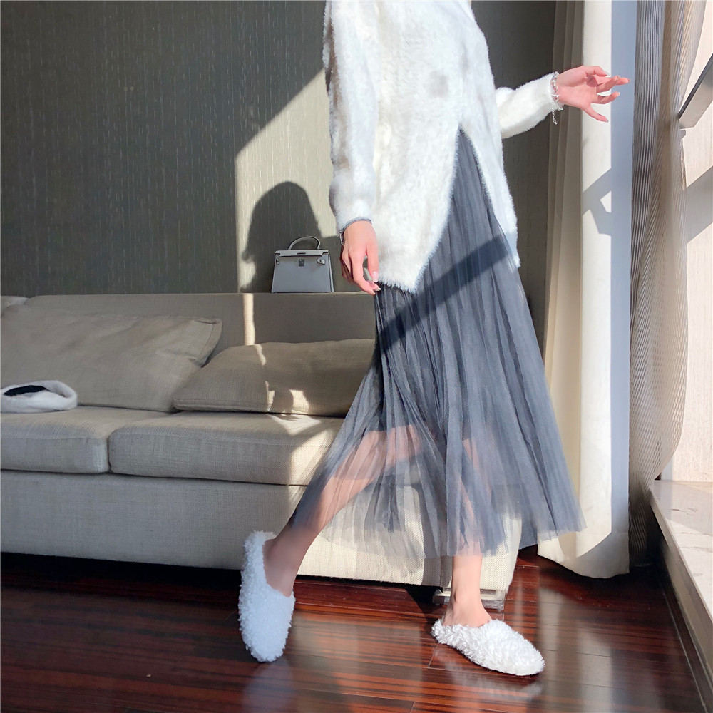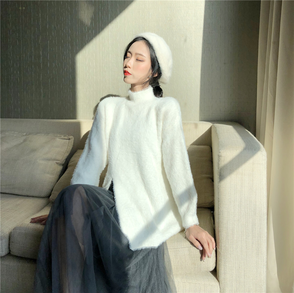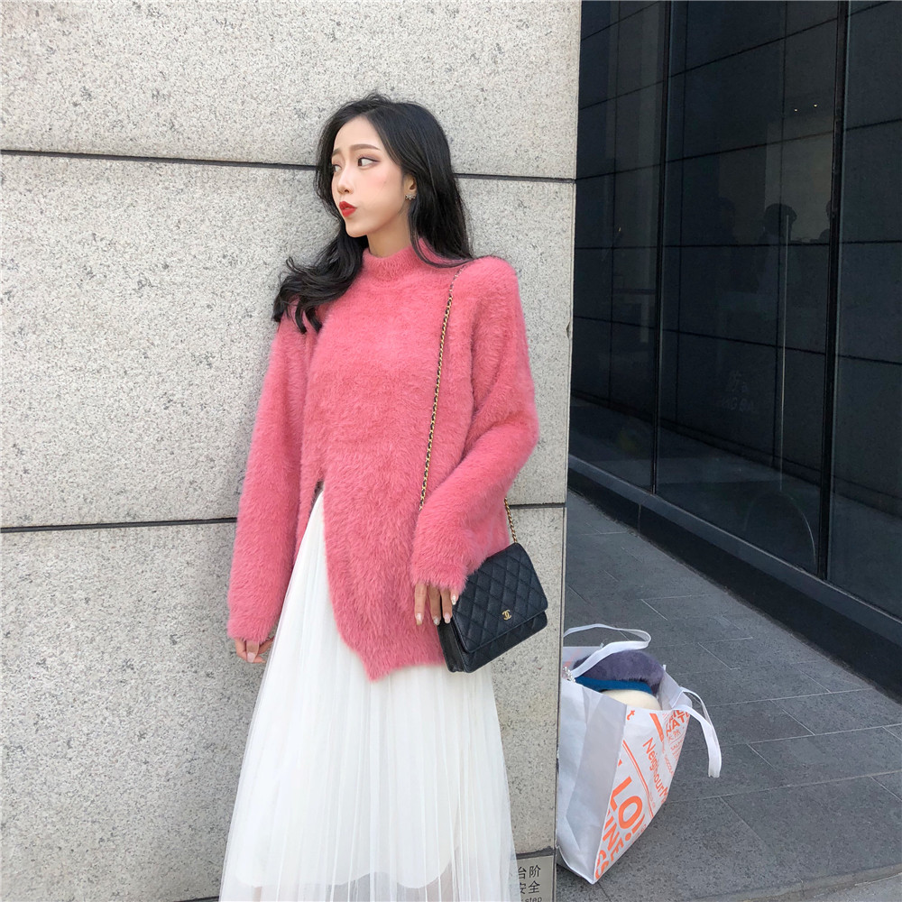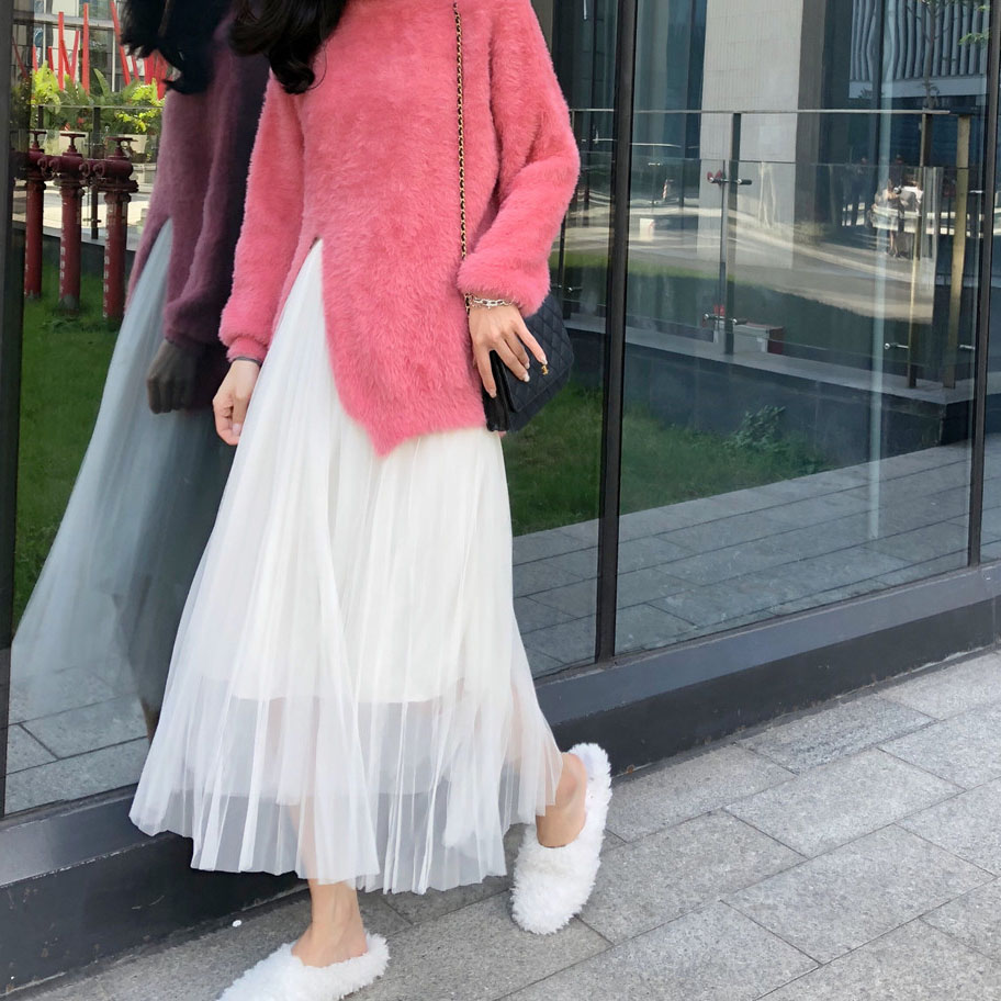 港味慵懶風半高領毛毛開叉毛衣女2018新款+仙女百褶裙半身裙套裝