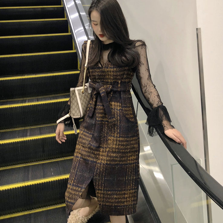 / 氣質復古韓版格子毛呢長款連衣裙+時尚喇叭袖網紗打底衫上衣女