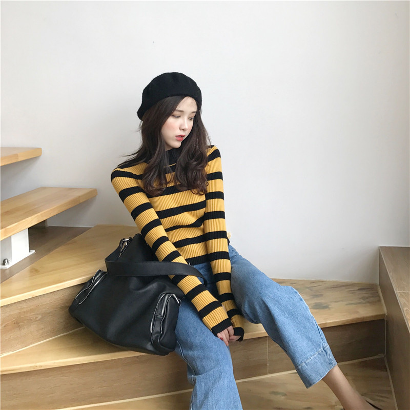 / chic風早秋上衣女2018新款韓版時尚顯瘦百搭條紋套手指針織衫毛衣