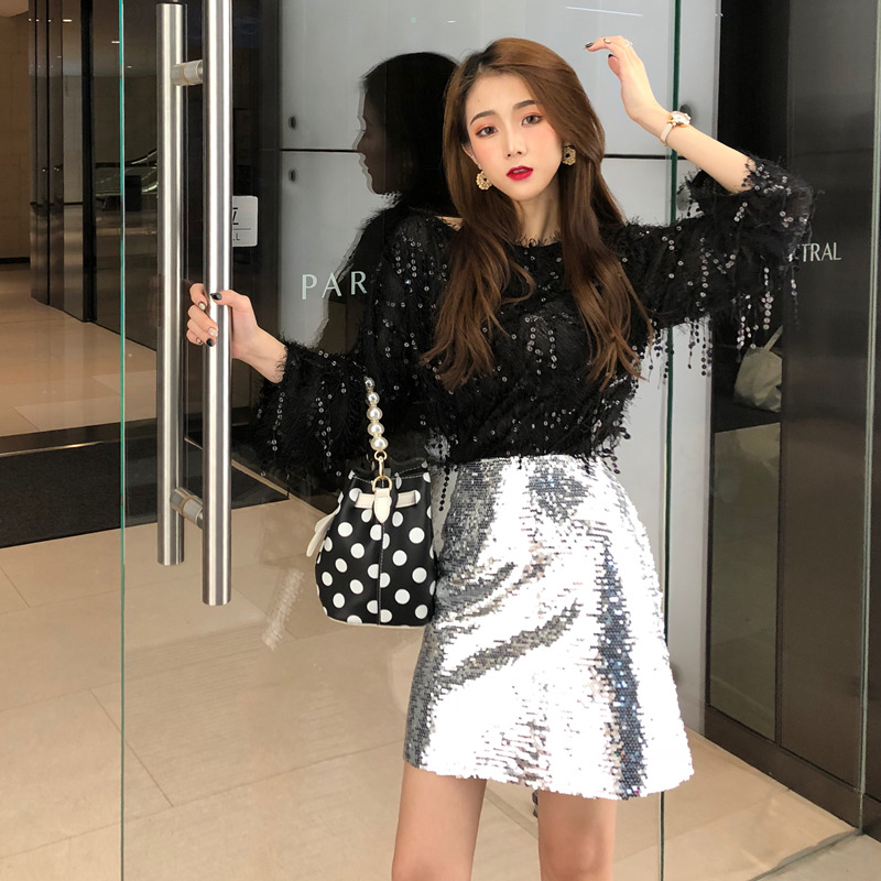 2018秋裝新款韓版兩件套女氣質重工流蘇亮片上衣珠片短裙時尚套裝