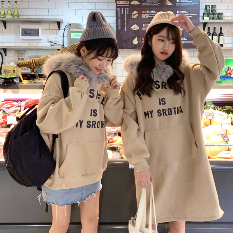 學院風大毛領連帽衛衣女秋冬裝2018新款韓版中長款寬松字母外套潮