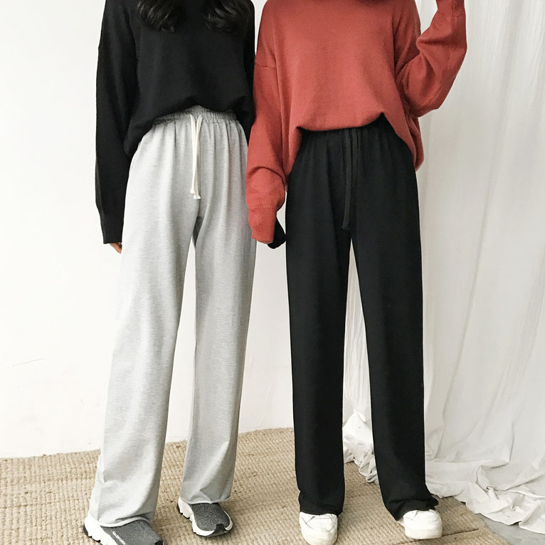 / 秋季新款復古韓國顯瘦百搭松緊腰闊腿褲氣質直筒綁帶休閑褲長褲女