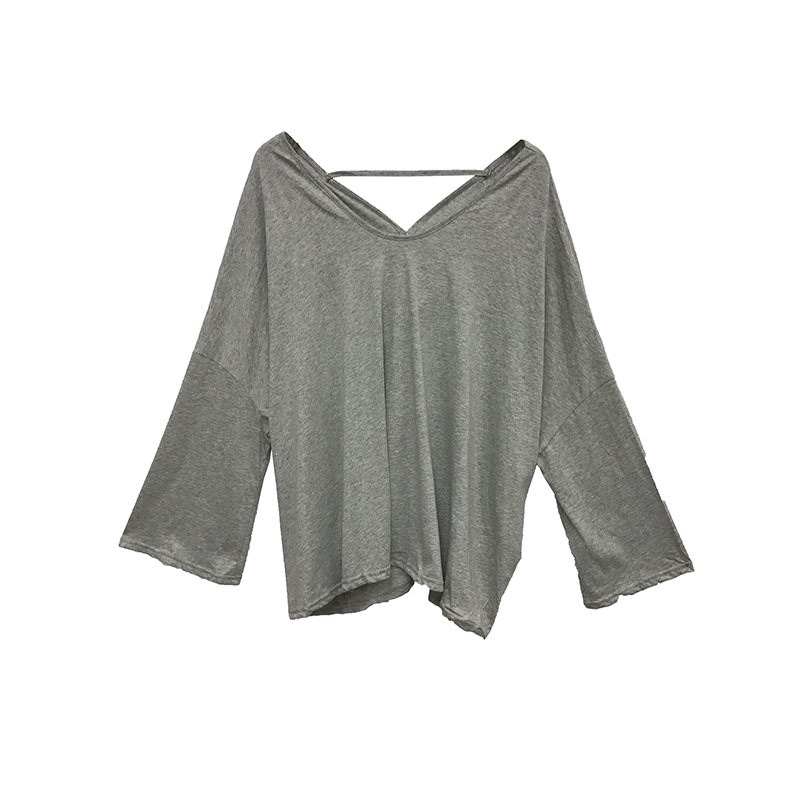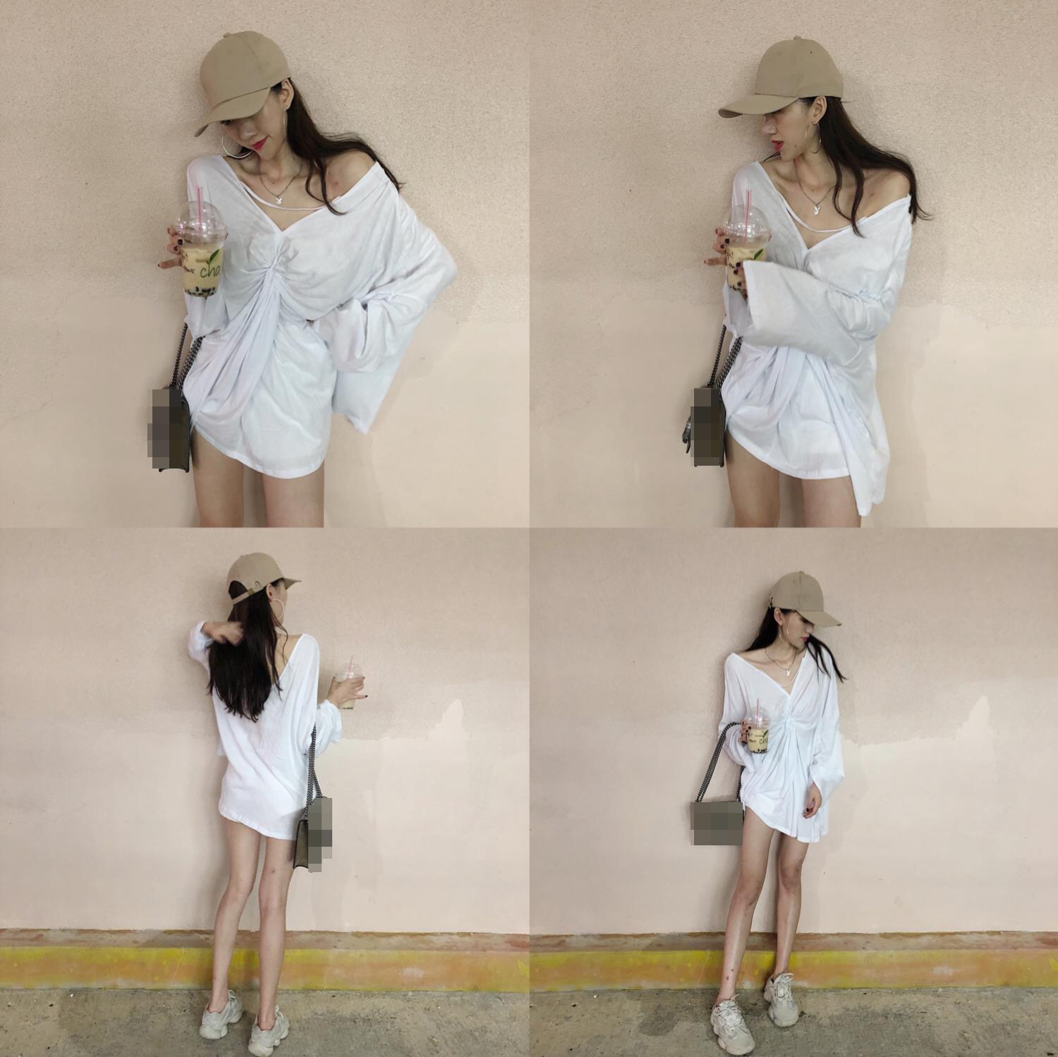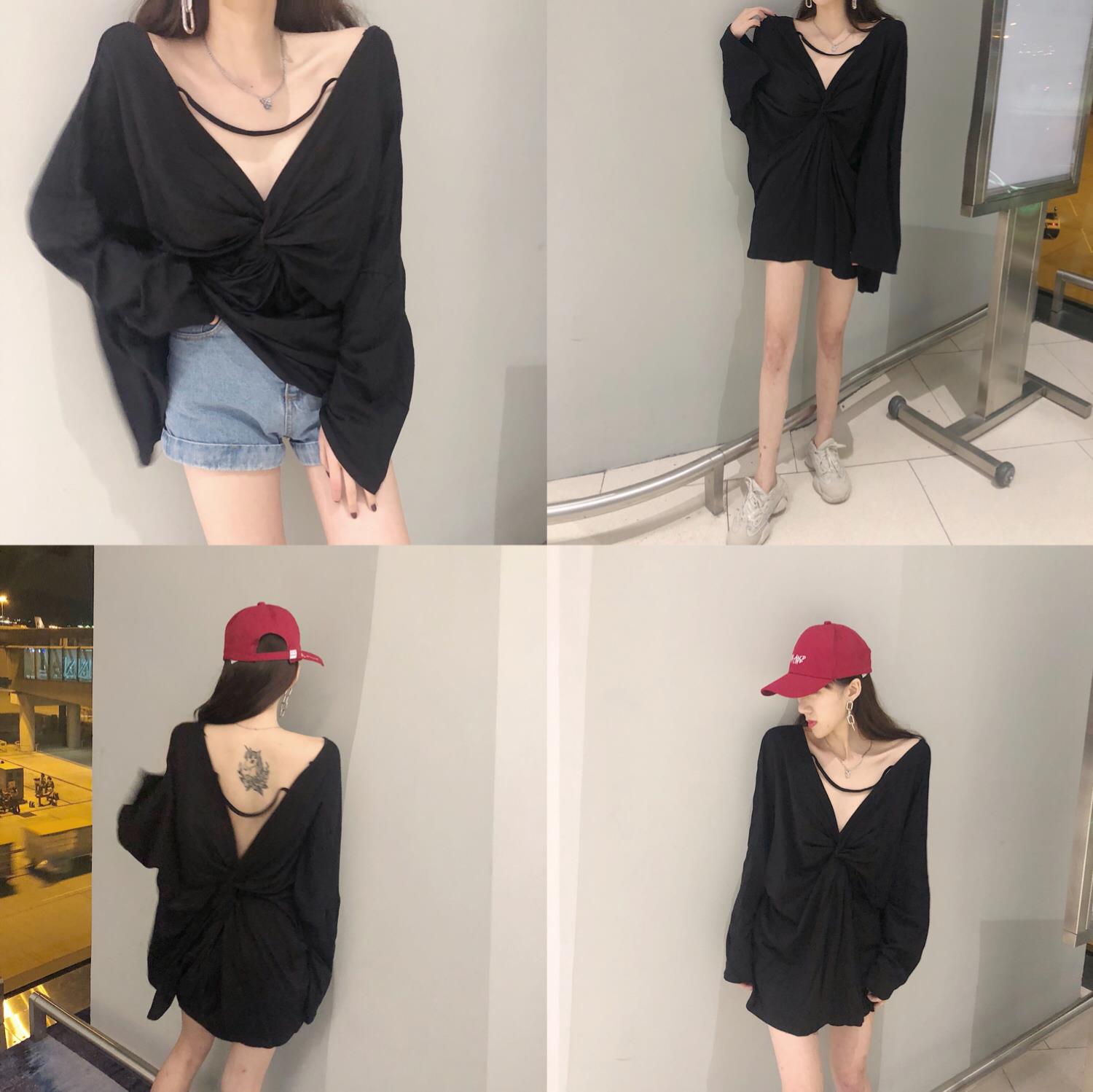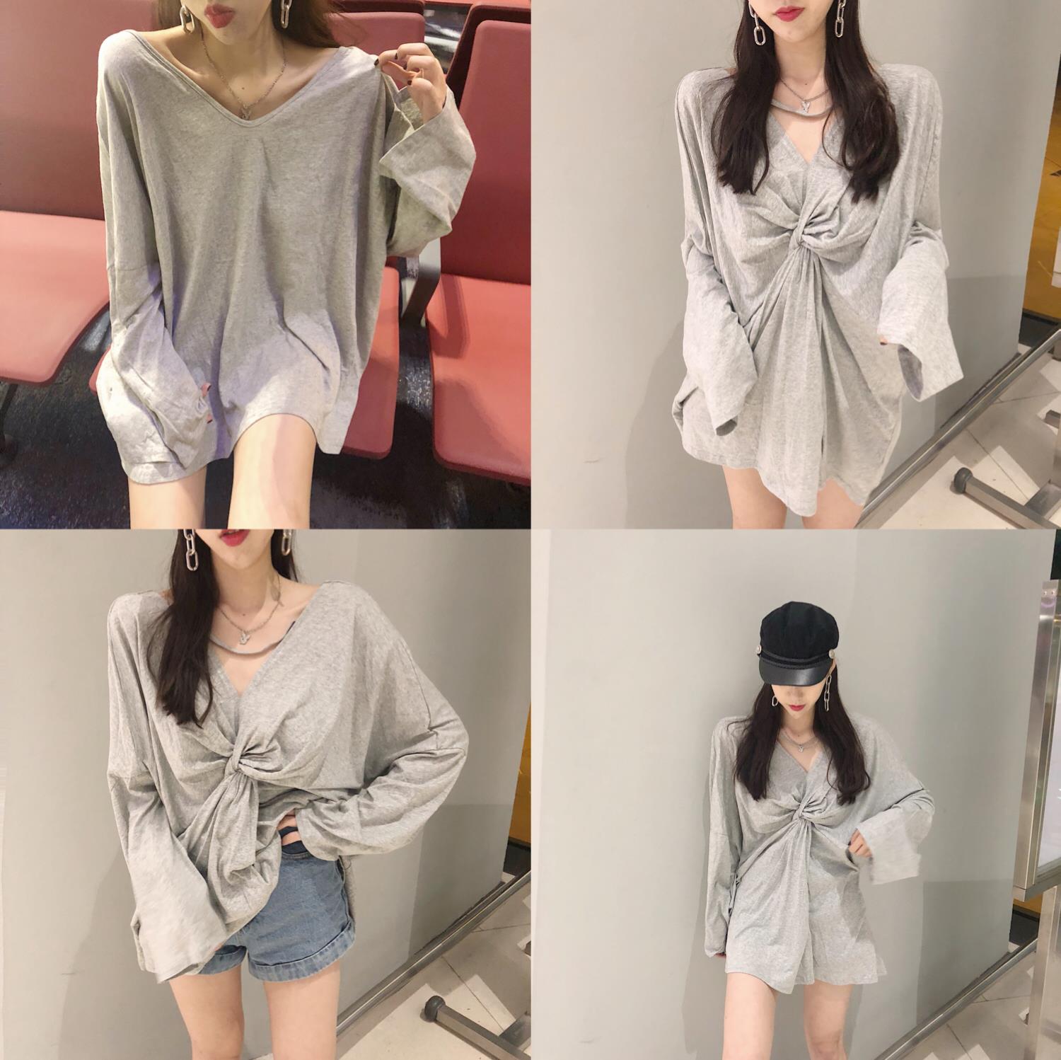 / 復古韓版簡約長袖寬松前后兩穿打結V領褶皺露背中長款百搭T恤女夏
