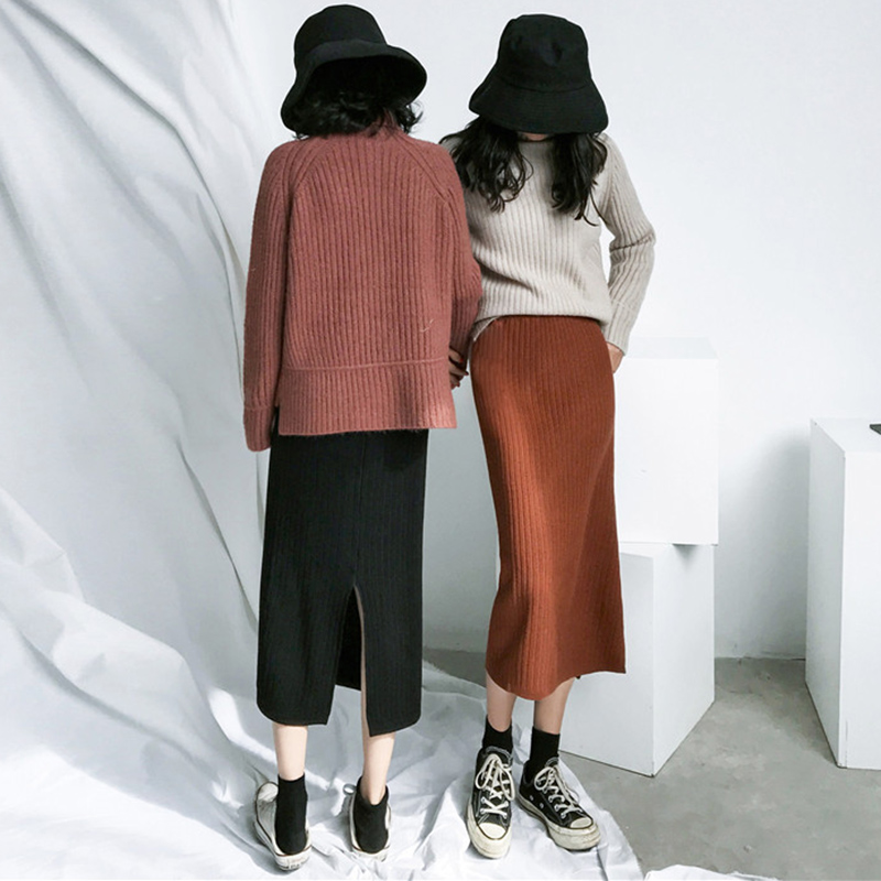 秋裝女2018新款韓版學生高腰開叉針織半身裙時尚港味黑色中長裙子