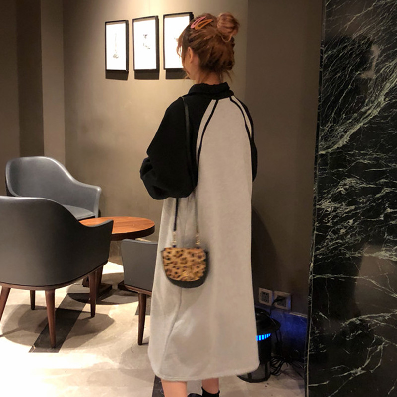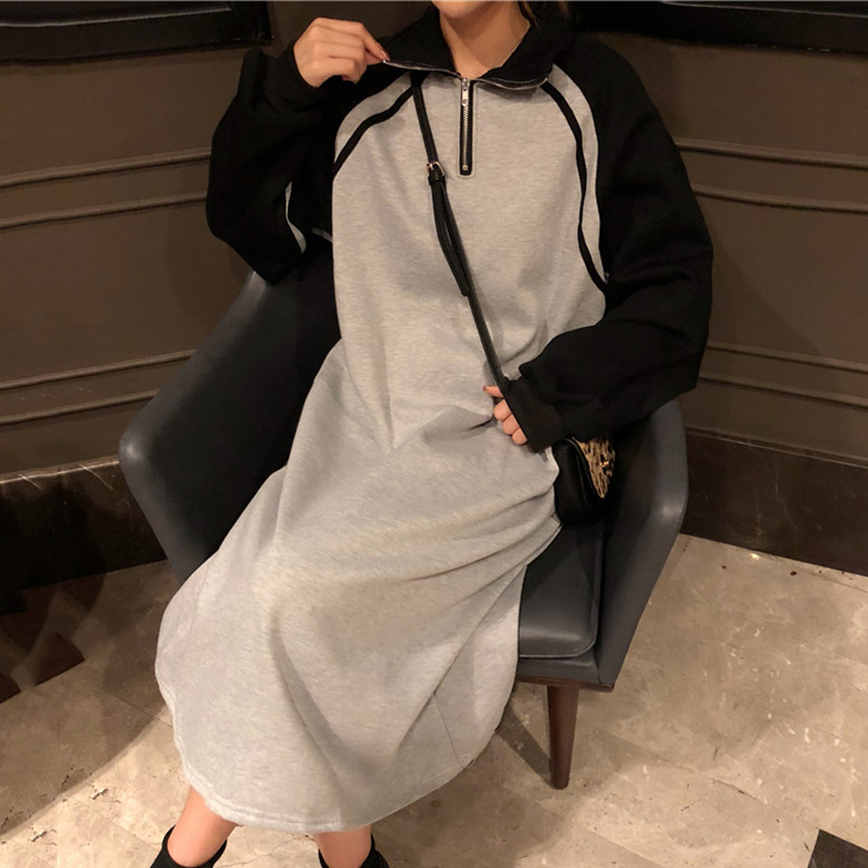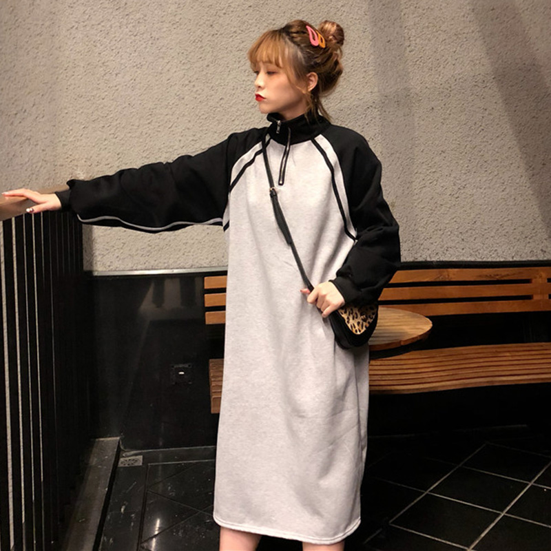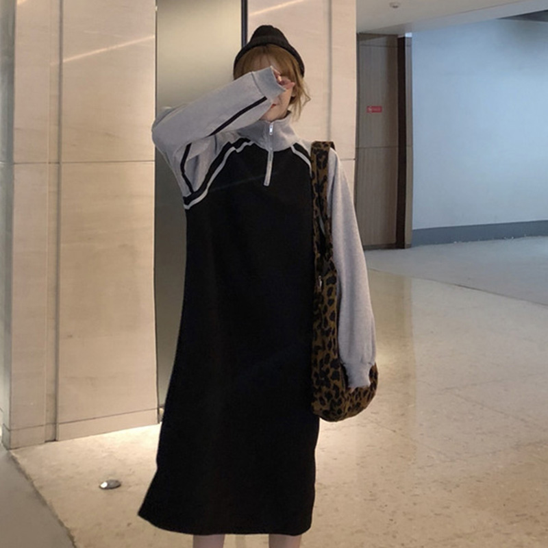 / 時尚拼色衛衣裙秋冬女裝新款加絨寬松長袖連衣裙立領休閑中長裙子