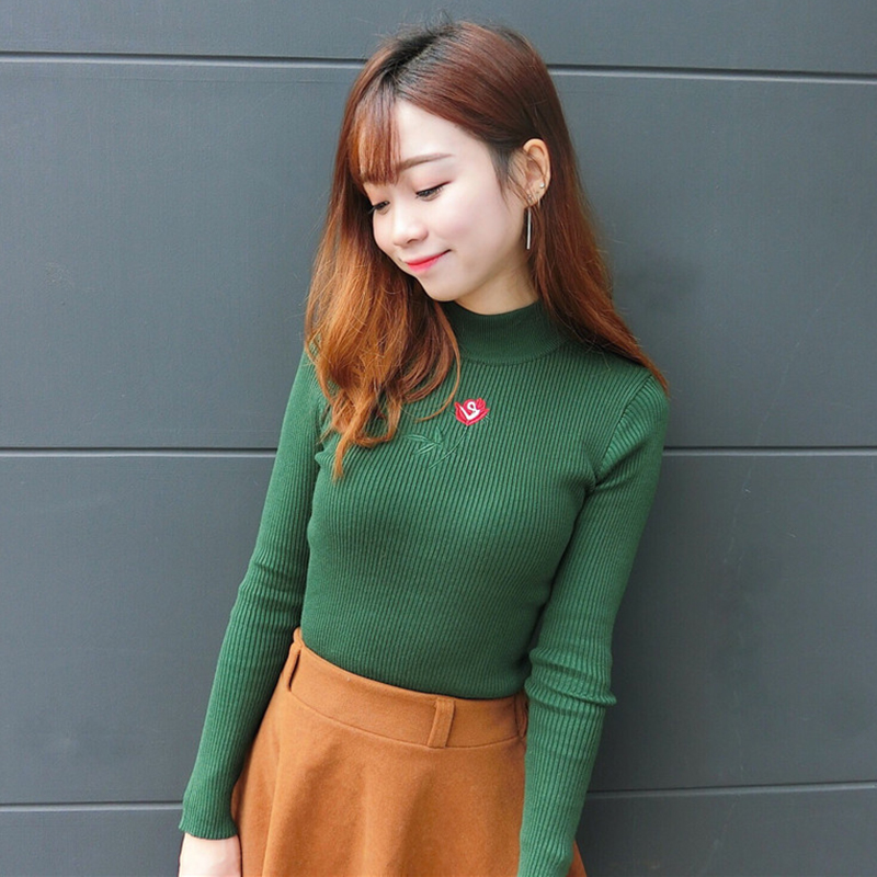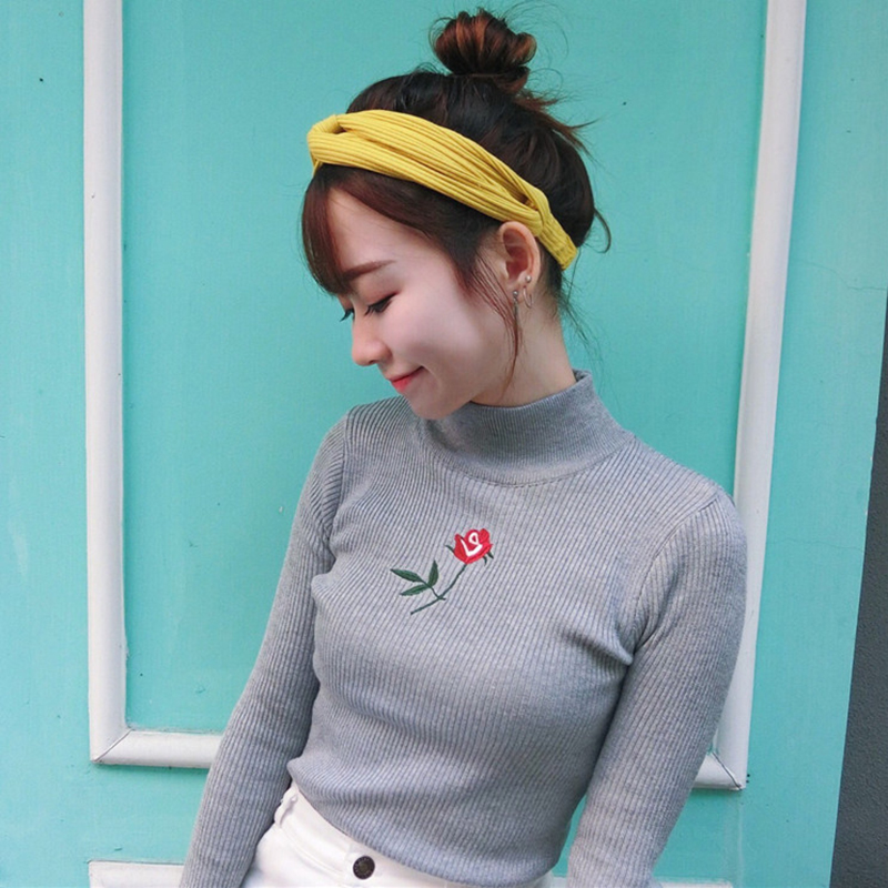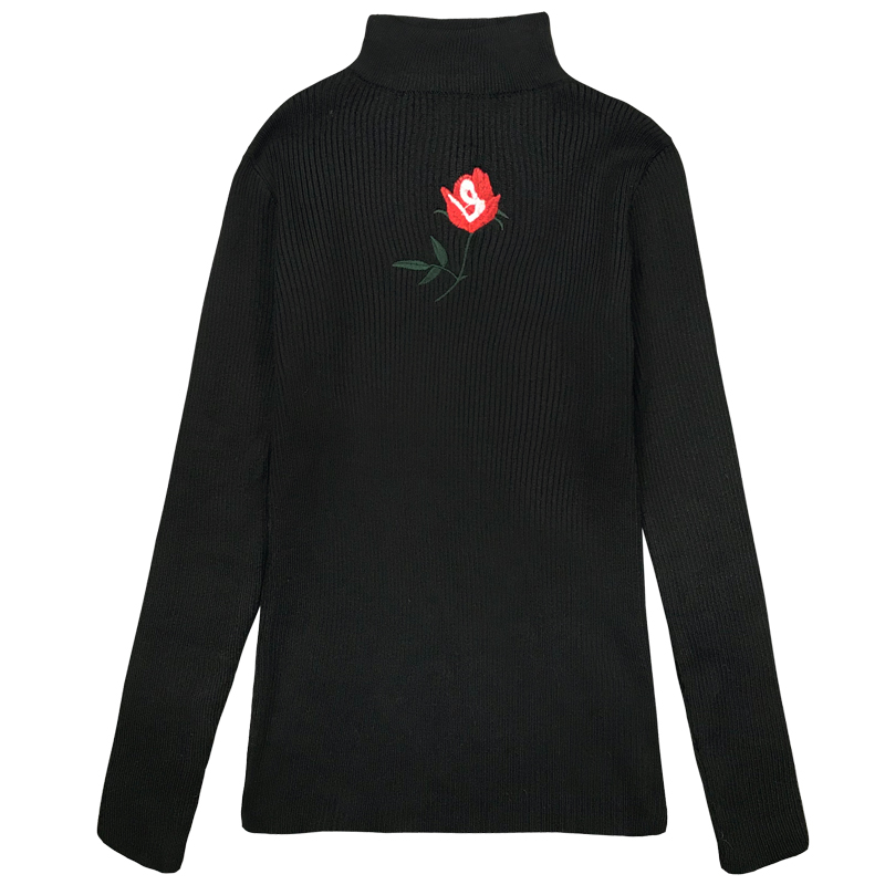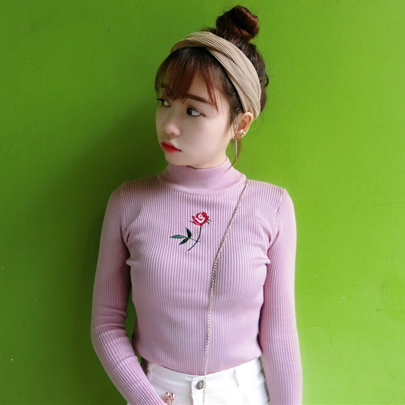 刺繡針織衫女秋裝2018新款韓版修身顯瘦半高領白色長袖打底上衣潮