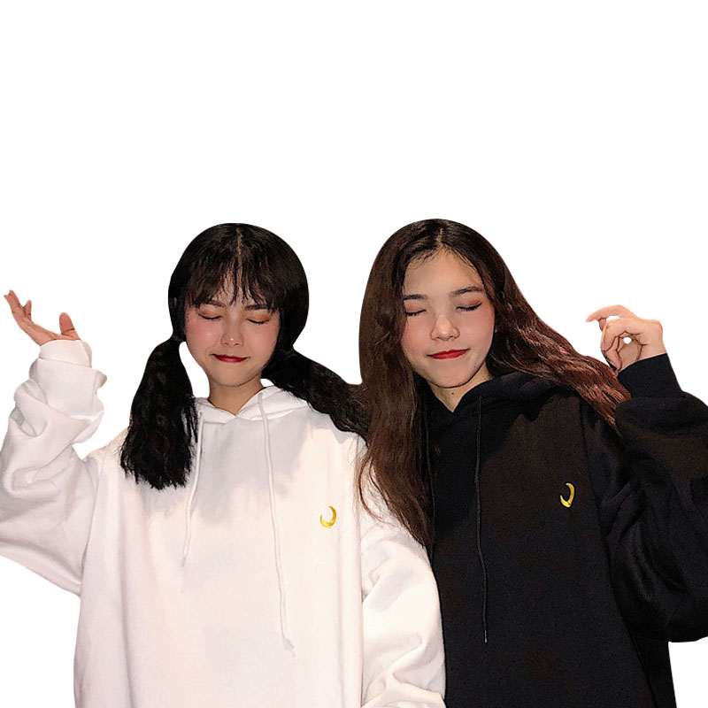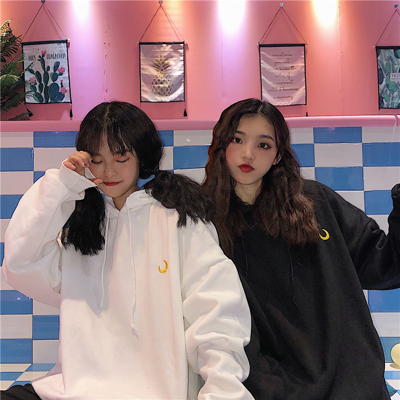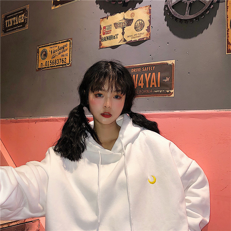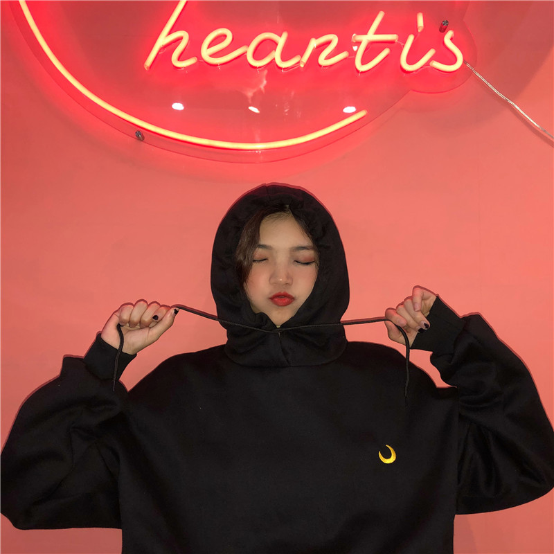 / 秋冬女裝韓版中長款原宿風寬松月亮刺繡加絨加厚閨蜜連帽衛衣外套