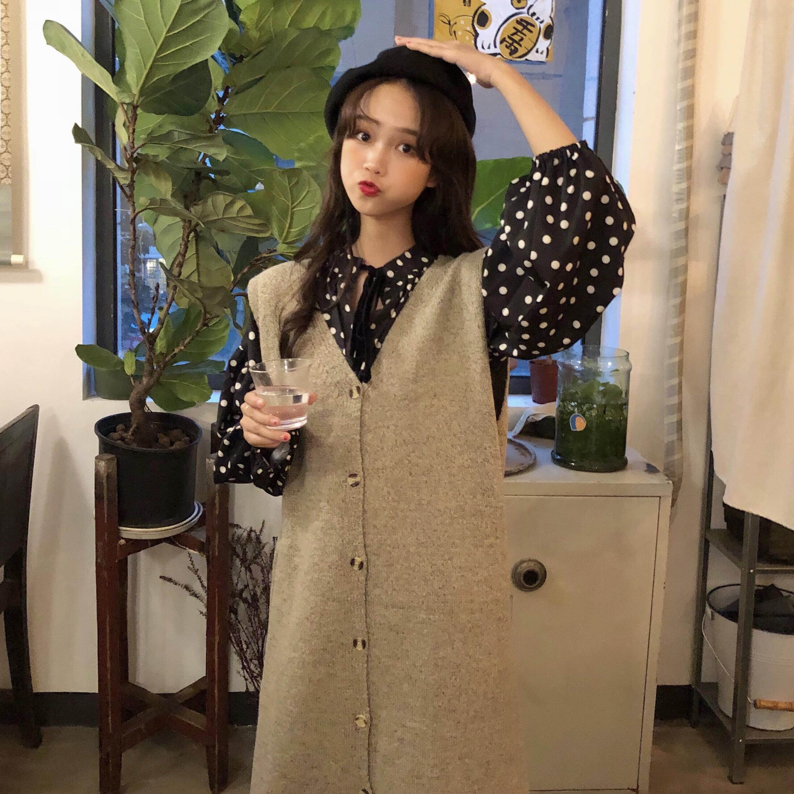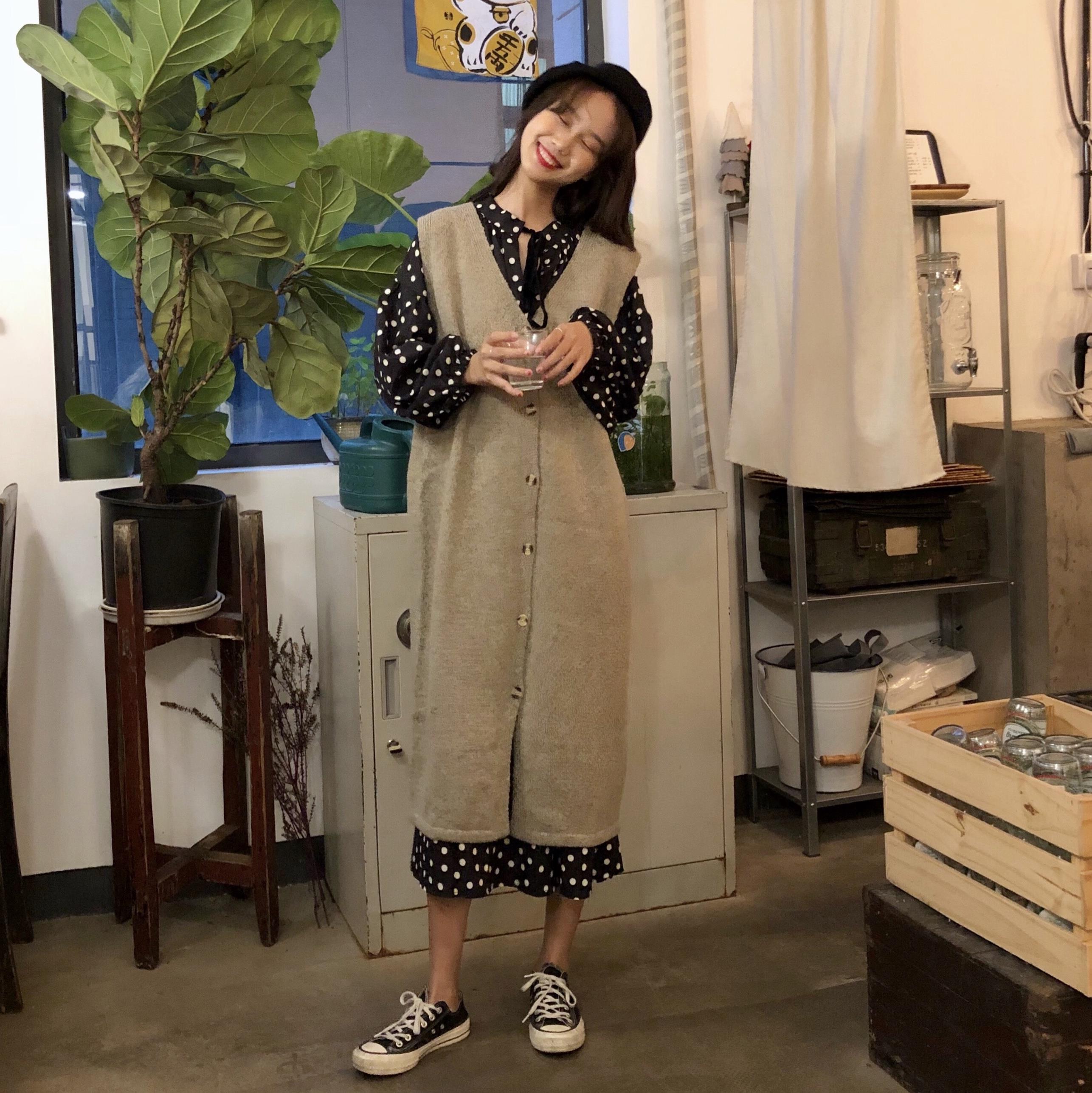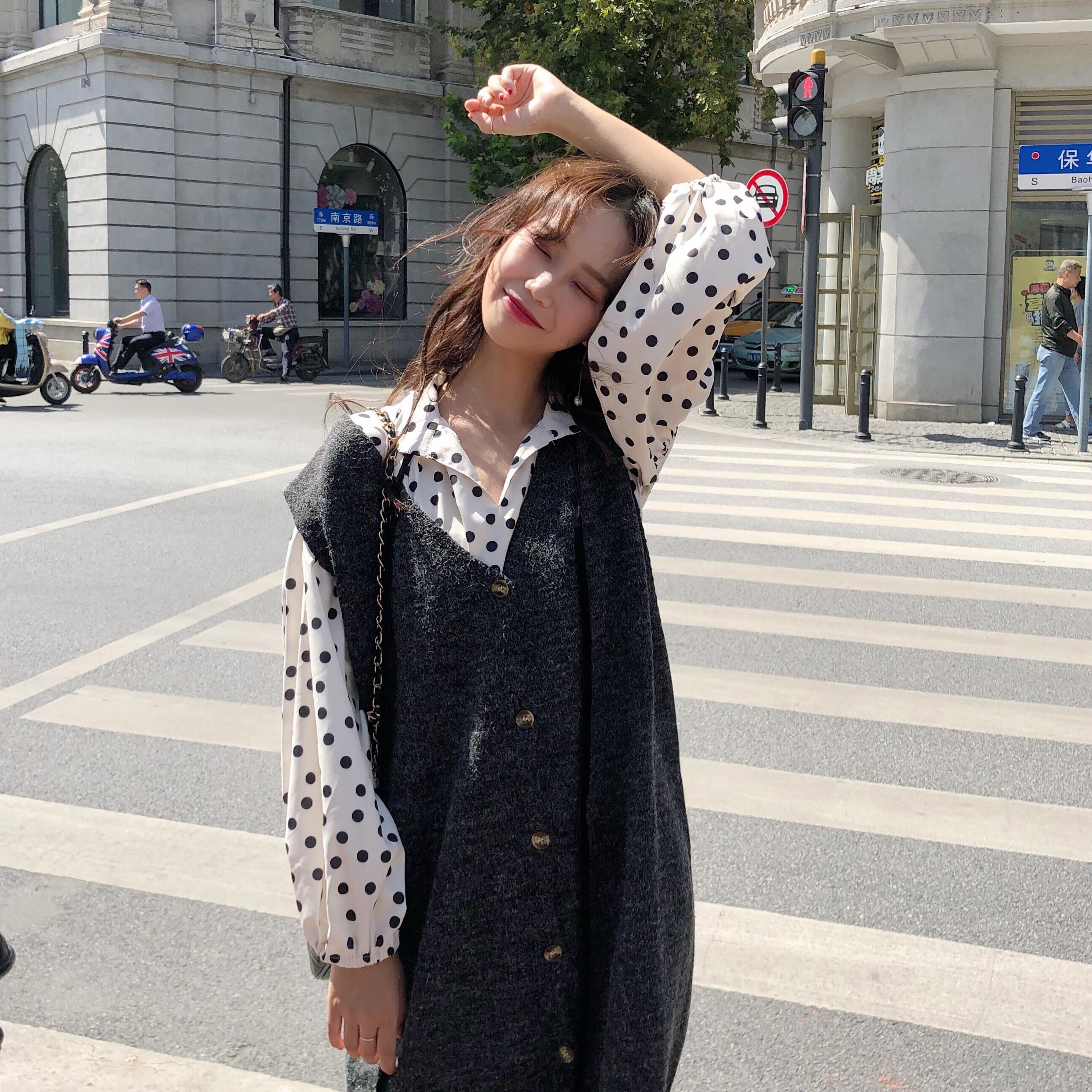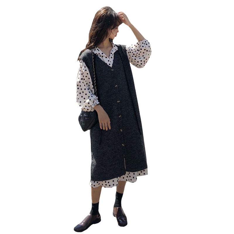 / 韓版時尚休閑套裝秋季波點連衣裙+慵懶風毛衣馬甲背心裙兩件套女