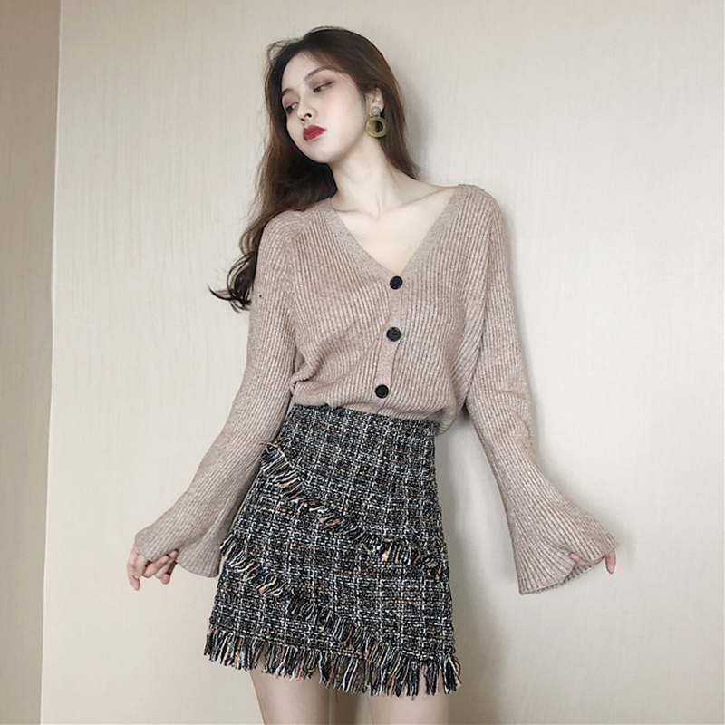 / 冷系套裝女秋新款V領喇叭袖針織毛衣開衫高腰粗花呢流蘇A字半身裙