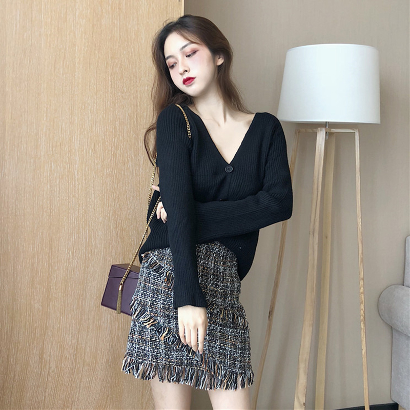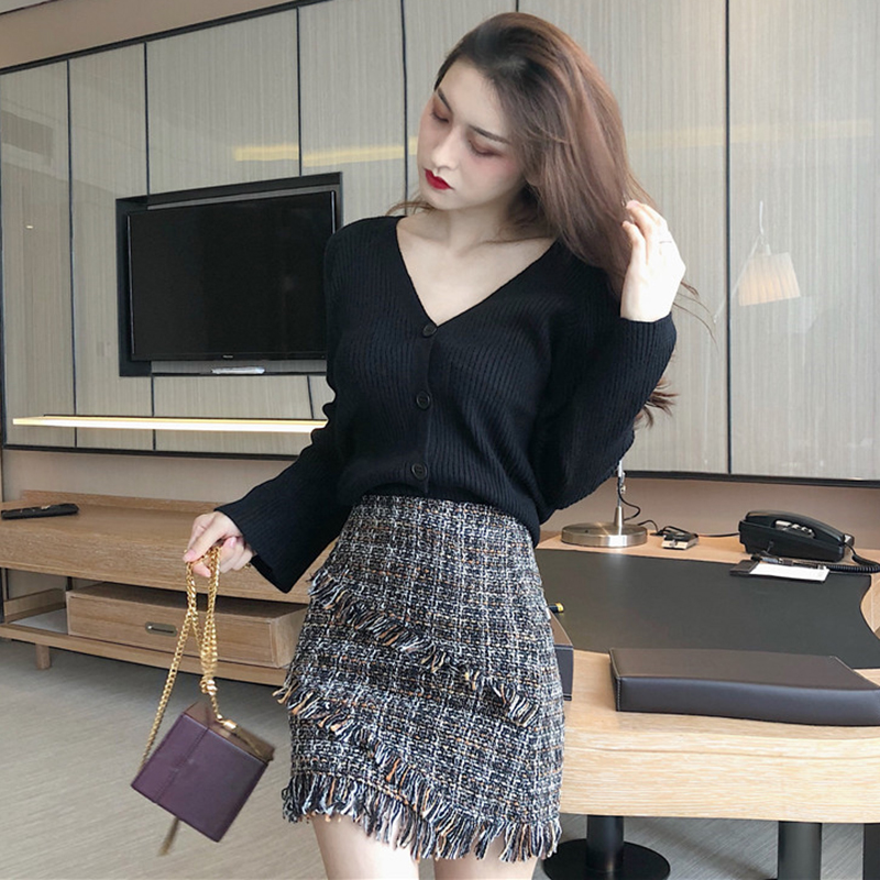 冷系套裝女秋新款V領喇叭袖針織毛衣開衫高腰粗花呢流蘇A字半身裙