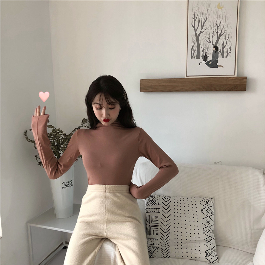 秋冬2018新款韓版百搭高領長袖體恤上衣修身顯瘦純色打底衫女學生