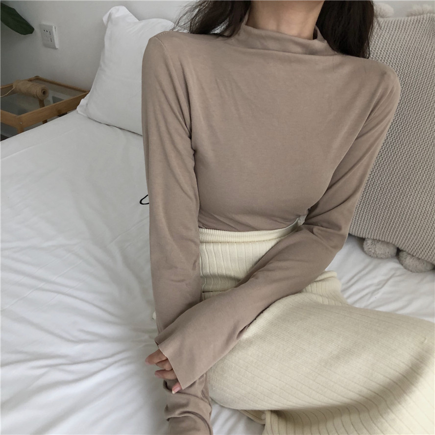 初秋新款女上衣韓版時尚chic基礎款百搭顯瘦高領純色打底衫t恤女