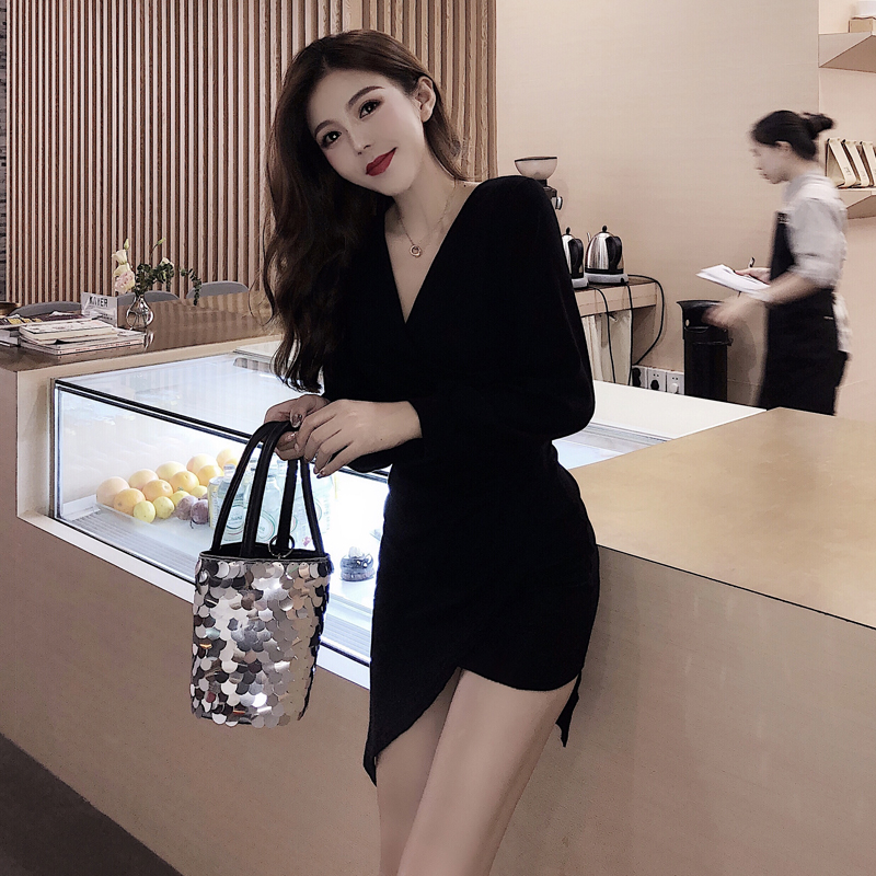 韓版時尚黑色v領連衣裙秋裝女2018新款修身長袖性感冷淡風包臀裙