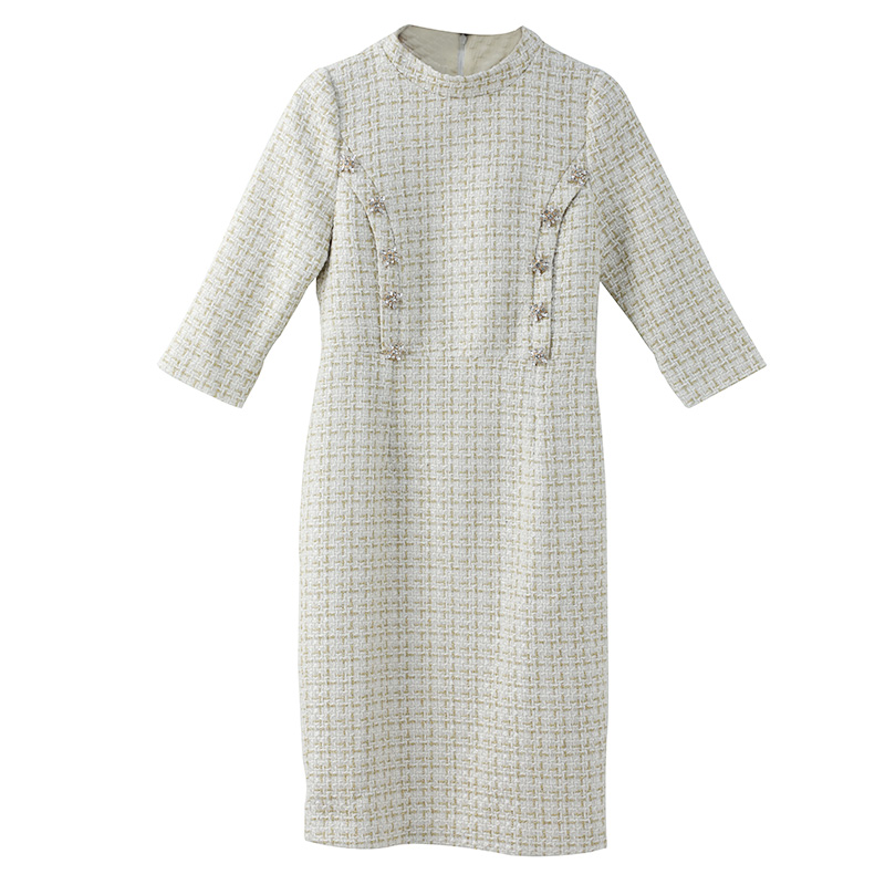 秋裝女2018新款毛呢格子連衣裙長袖毛衣釘珠小香風修身粗花呢裙子