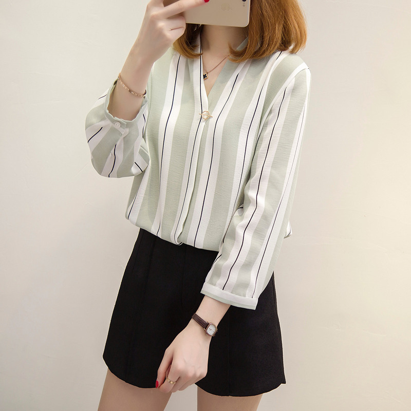 / 條紋襯衫女V領韓風chic小清新上衣白襯衣女長袖夏裝新款韓范