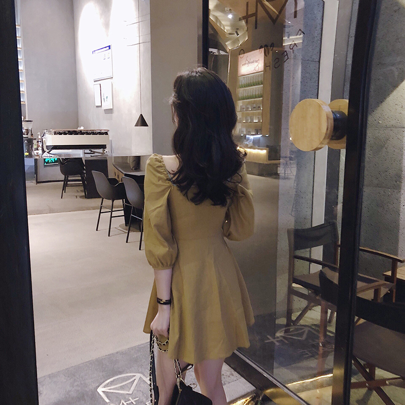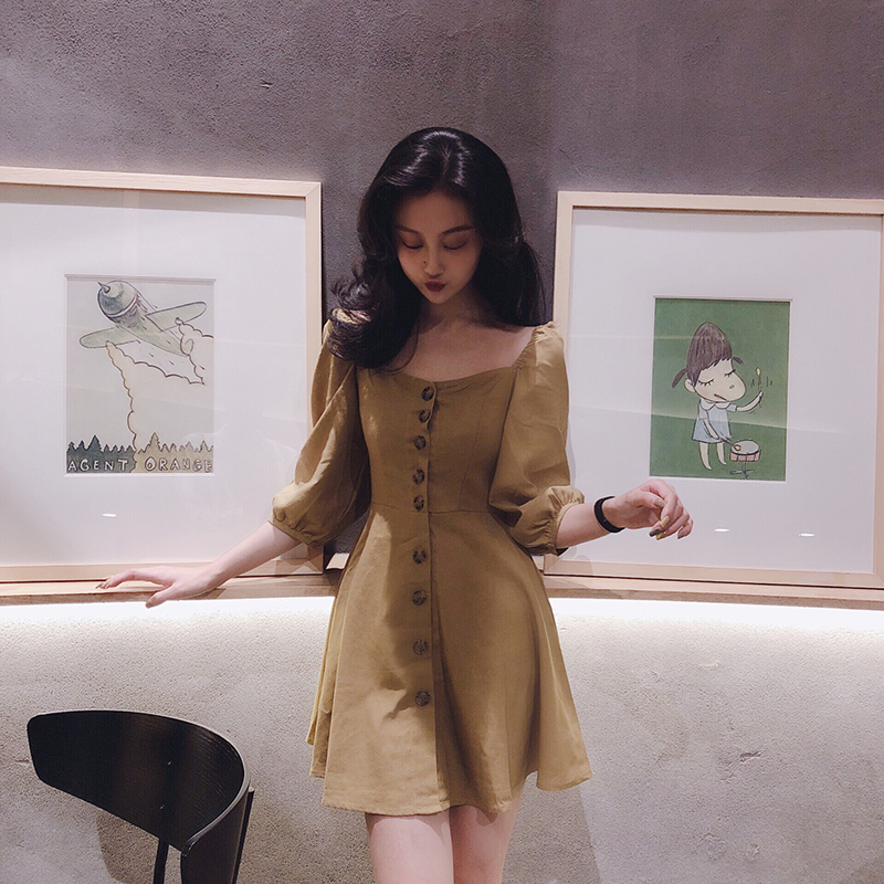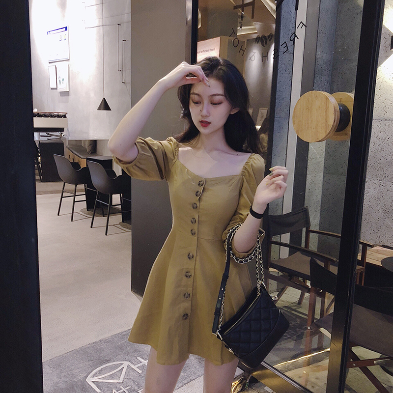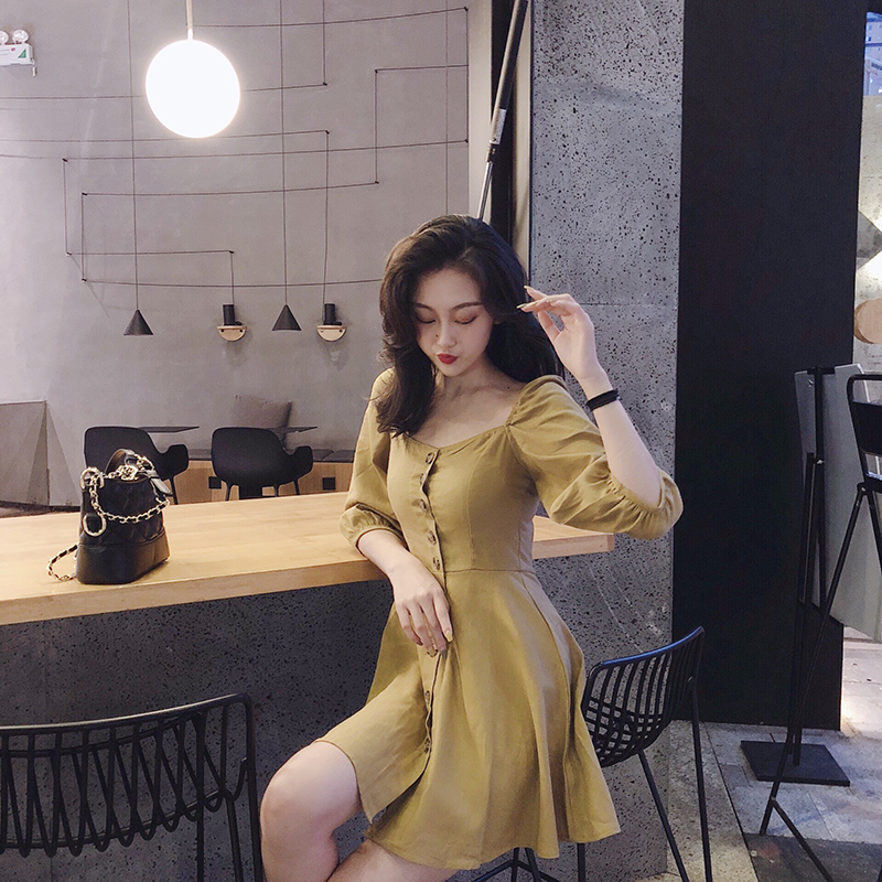 / 小香風新款收腰顯瘦復古chic時尚百搭方領短裙單排扣修身連衣裙女