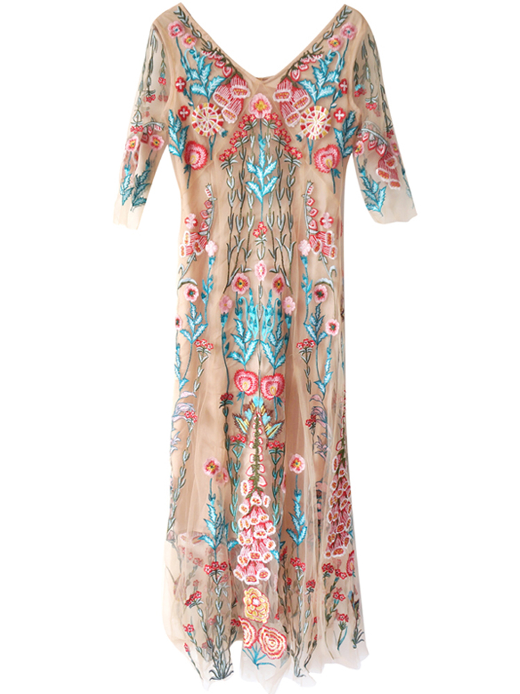 / 2018夏裝新款波西米亞超仙仙氣V領刺繡網紗大擺長裙露背連衣裙