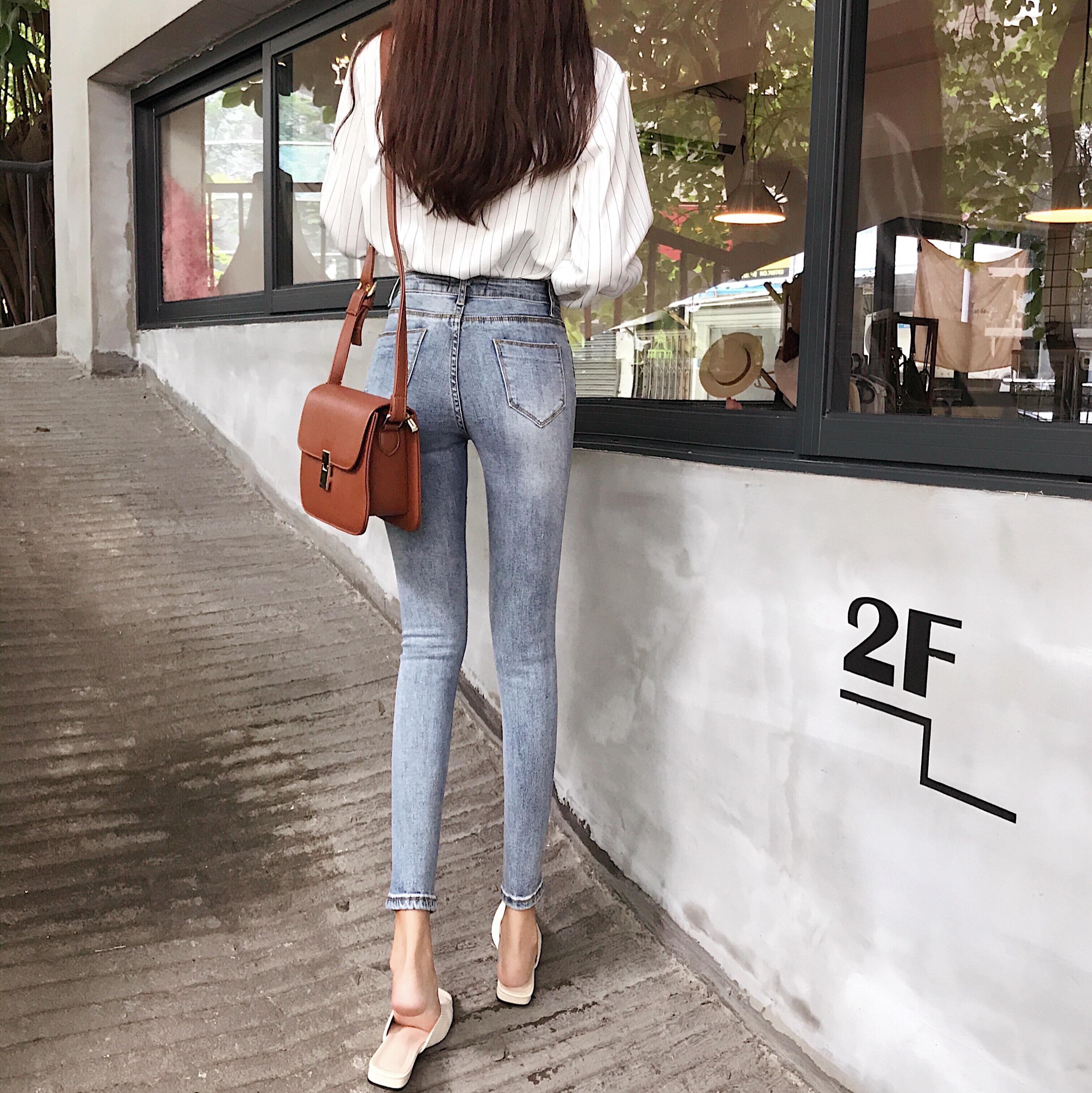 新款chic秋季破洞剪邊九分牛仔褲女韓版修身顯瘦高腰小腳鉛筆褲潮