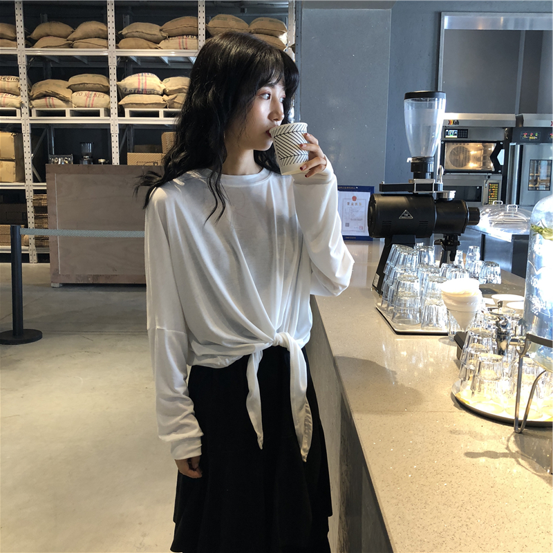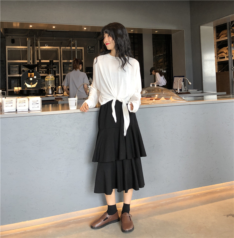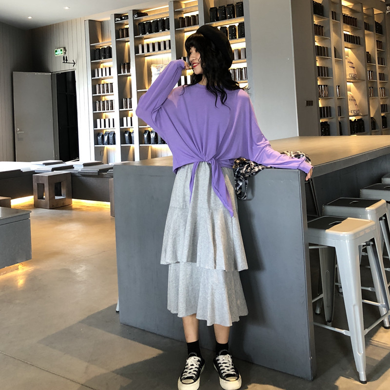 / 韓版時尚休閑套裝秋季寬松長袖系帶t恤+高腰蛋糕裙半身裙兩件套女